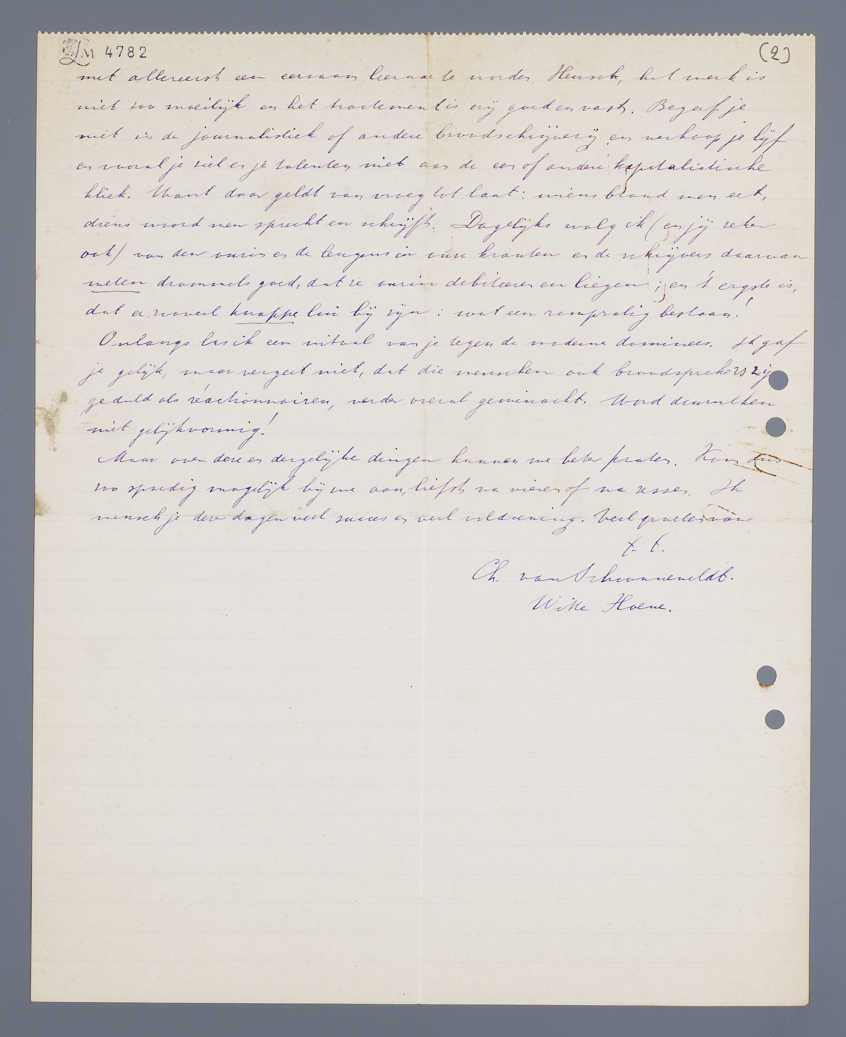 Beste Menno, neem nog een goeden, ja een vaderlijken raad van me aan. Solliciteer dadelijk naar een of ander (liefst klein) gymnasium en begin met allereerst een eerzaam leraar te worden. Heusch, het werk is niet zoo moeilijk en het tractement is erg goed en vast. Begeef je niet in de journalistiek of andere broodschrijverij en verkoop je lijf en vooral je ziel en je talenten niet aan de een of andere kapitalistische kliek. Want daar geldt van vroeg tot laat: wiens brood men eet, diens woord men spreekt en schrijft. Dagelijks walg ik (en jij zeker ook) van den onzin en leugens in onze kranten en de schrijvers daarvan weten drommels goed, dat ze onzin debiteeren en liegen; en 't ergste is dat er zooveel knappe lui bij zijn: wat een rampzalig bestaan!