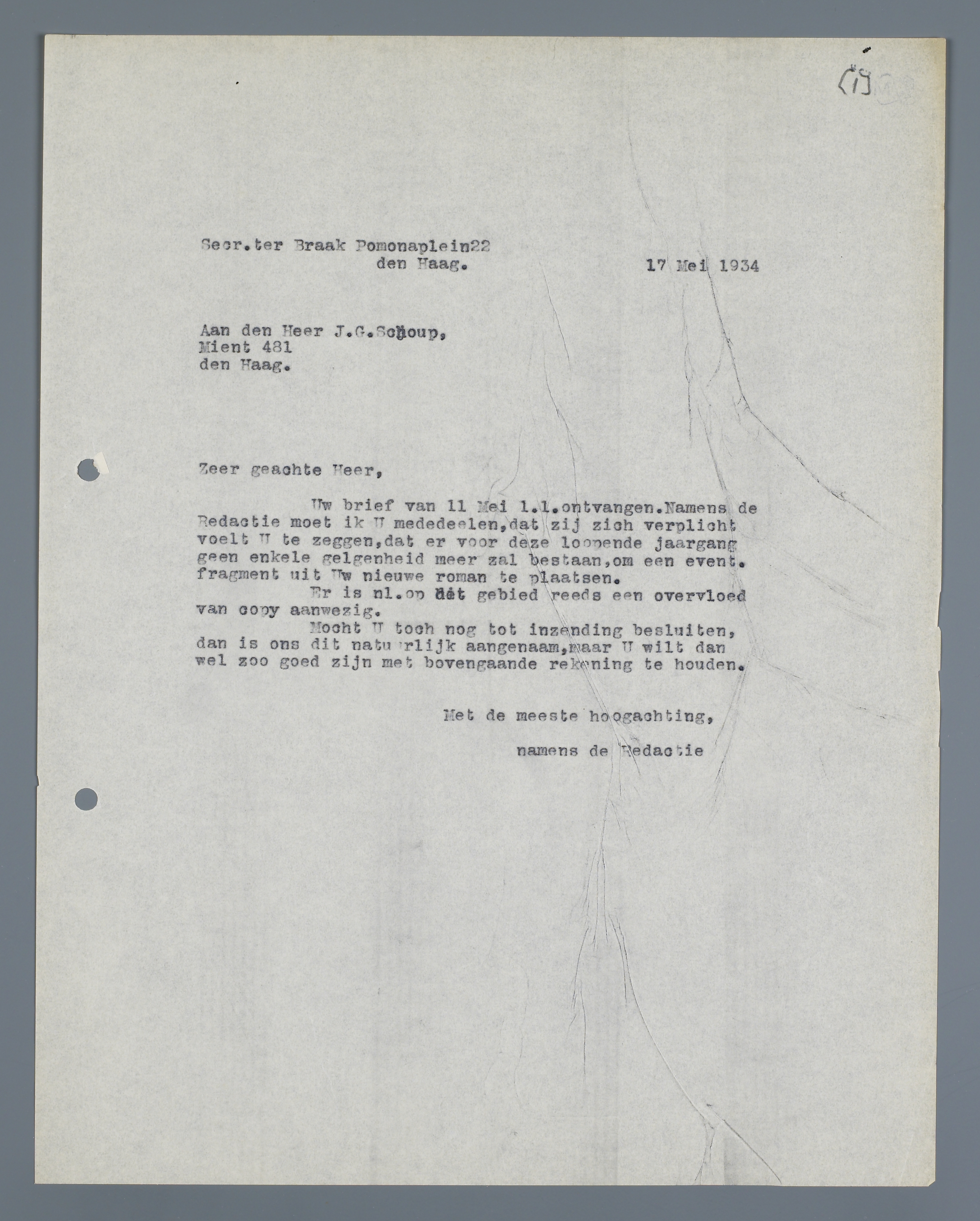 Uw brief van 11 Mei l.l. ontvangen. Namens de Redactie moet ik U mededeelen, dat zij zich verplicht voelt U te zeggen, dat er voor deze loopende jaargang geen enkele mogelijkheid meer zal bestaan, om een event. fragment uit Uw nieuwe roman te plaatsen.
