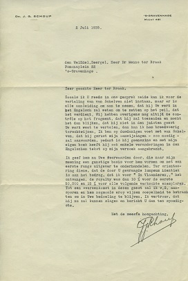 Zooals ik U reeds in ons gesprek zeide kan ik voor de vertaling van van Schelven niet instaan, maar er is alle aanleiding om aan te nemen, dat hij Uw werk in het Engelsch zal weten om te zetten op het peil, dat het verdient. Wij hebben overigens nog altijd de controle op het fragment, dat hij zal toezenden en mocht het dan blijken, dat hij niet in den juisten geest Uw werk weet te vertalen, dan kan ik hem breedvoerig terechtwijzen. Ik ben op dusdanigen voet met van Schelven, dat hij gerust mijn aanwijzingen – zoo noodig – zal aanvaarden, pedant is hij geenszins en met mijn eigen boek heeft hij ook enkele veranderingen in den Engelschen tekst op mijn verzoek aangebracht.