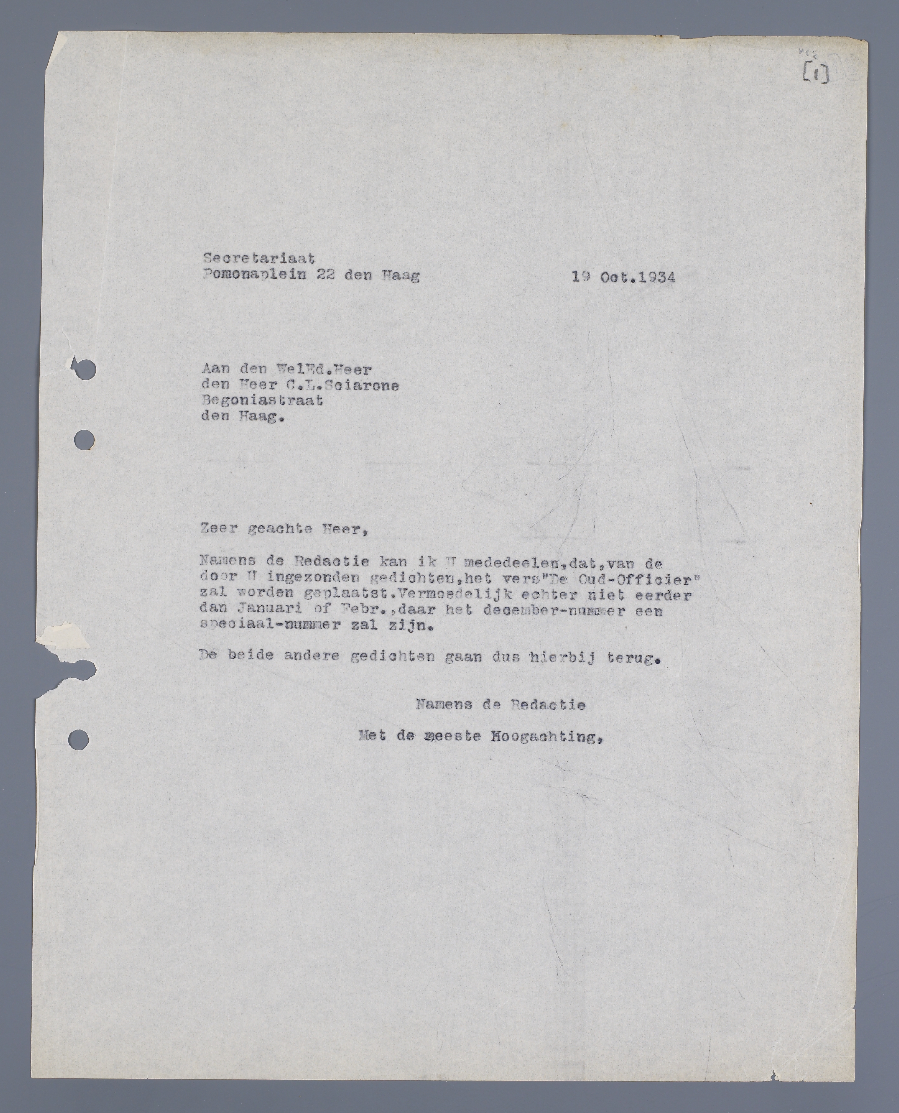 Namens de Redactie kan ik U mededeelen, dat, van de door U ingezonden gedichten, het vers ‘De Oud-Officier’ zal worden geplaatst. Vermoedelijk echter niet eerder dan Januari of Febr., daar het december-nummer een speciaal-nummer zal zijn.