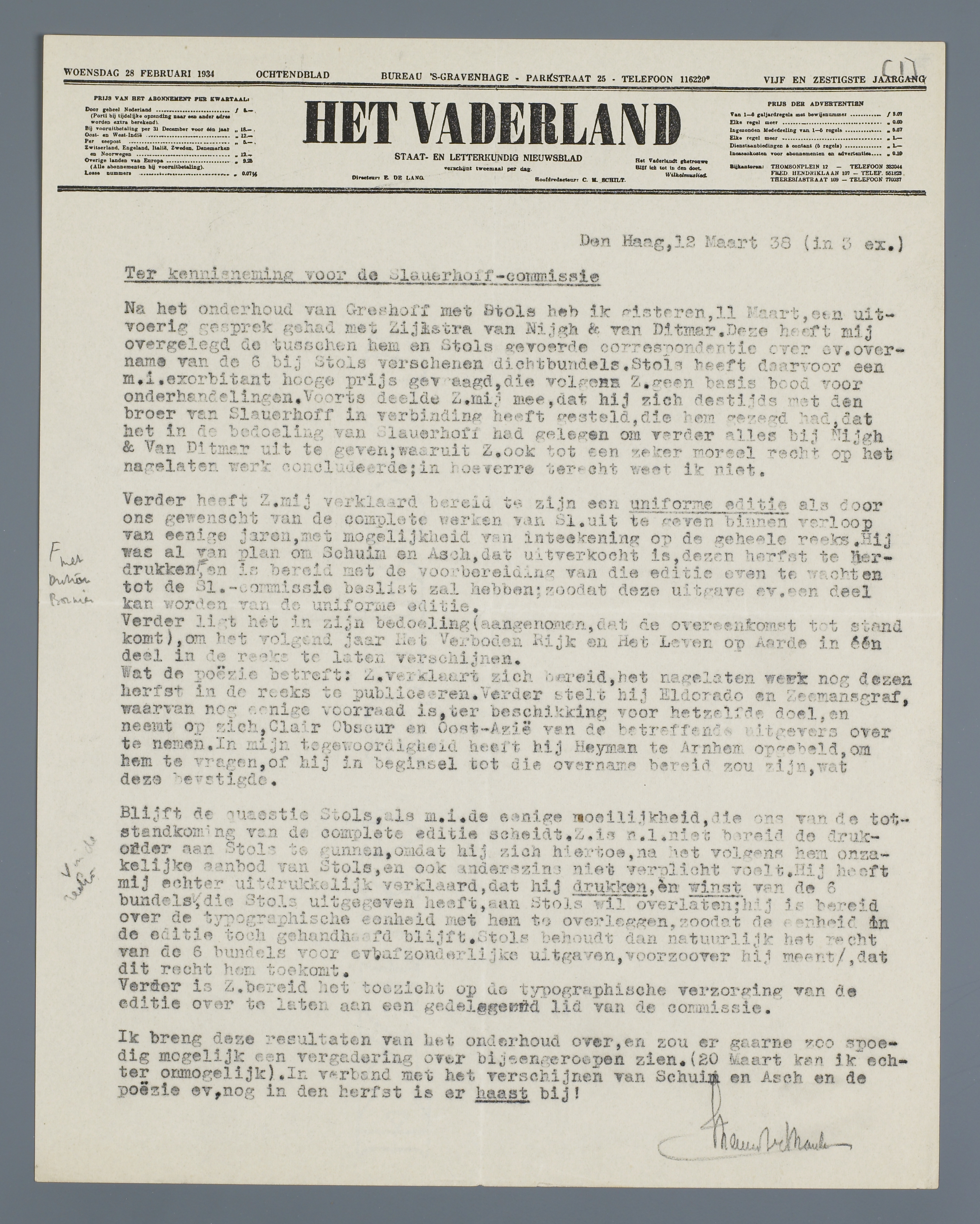 Na het onderhoud van Greshoff met Stols heb ik gisteren, 11 Maart, een uitvoerig gesprek gehad met Zijlstra van Nijgh & Van Ditmar. Deze heeft mij overgelegd de tusschen hem en Stols gevoerde correspondentie over ev. overname van de 6 bij Stols verschenen dichtbundels. Stols heeft daarvoor een m.i. exorbitant hooge prijs gevraagd, die volgens Z. Geen basis bood voor onderhandelingen. Voorts deelde Z. mij mee, dat hij zich destijds met den broer van Slauerhoff in verbinding heeft gesteld, die hem gezegd had, dat het in de bedoeling van Slauerhoff had gelegen om verder alles bij Nijgh & Van Ditmar uit te geven; waaruit Z. ook tot een zeker moreel recht op het nagelaten werk concludeerde; in hoeverre terecht weet ik niet.