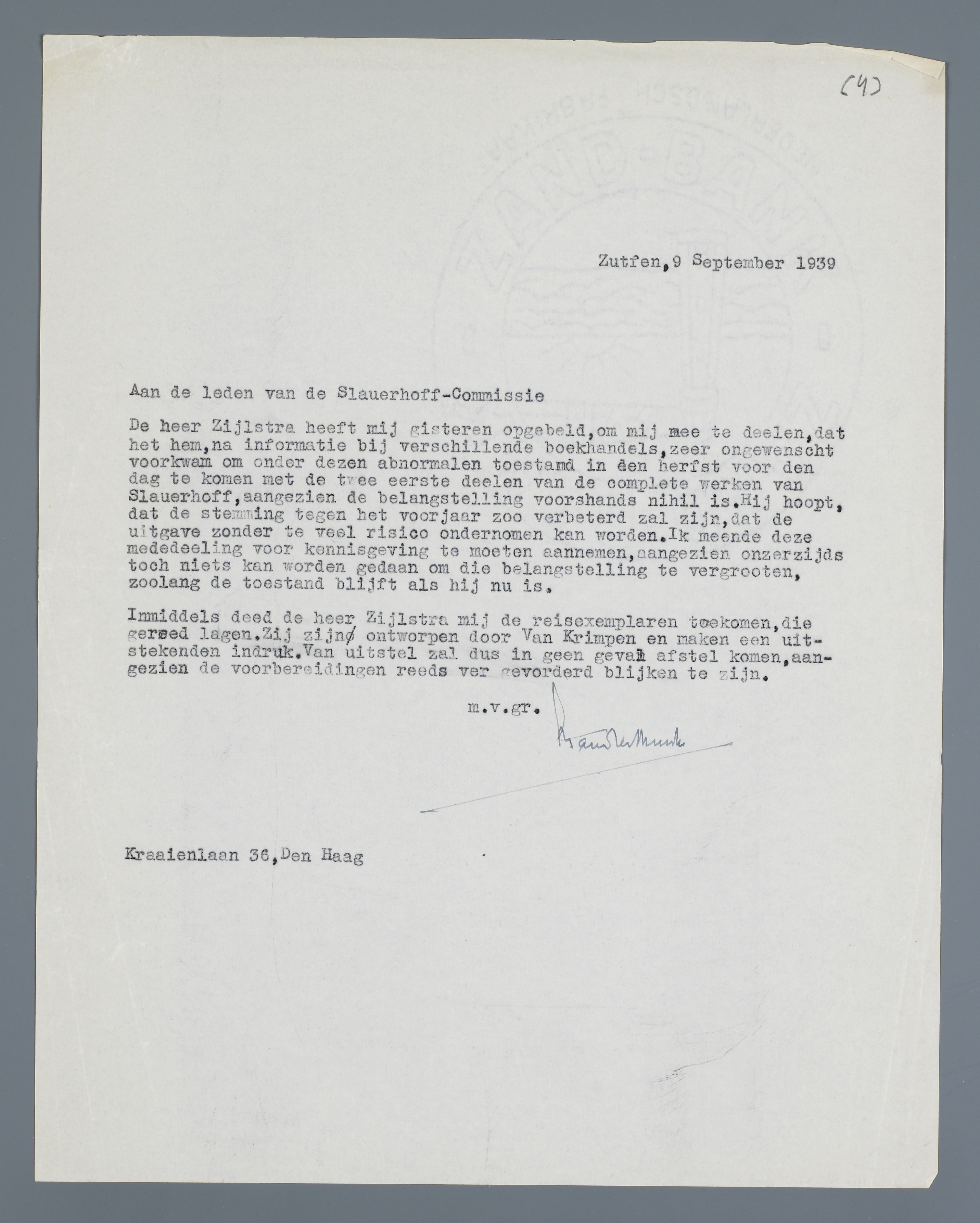 De heer Zijlstra heeft mij gisteren opgebeld, om mij mee te deelen, dat het hem, na informatie bij verschillende boekhandels, zeer ongewenscht voorkwam, onder dezen abnormalen toestand in den herfst van dit jaar voor den dag te komen met de twee eerste deelen van de complete werken van Slauerhoff, aangezien de belangstelling voorshands nihil is. Hij hoopt, dat de stemming tegen het voorjaar zoo verbeterd zal zijn, dat de uitgave zonder te veel risico mogelijk is. Ik meende deze mededeeling voor kennisgeving te moeten aannemen, aangezien onzerzijds toch niets kan worden gedaan om de belangstelling te vergrooten, zoolang de toestand blijft als hij nu is.