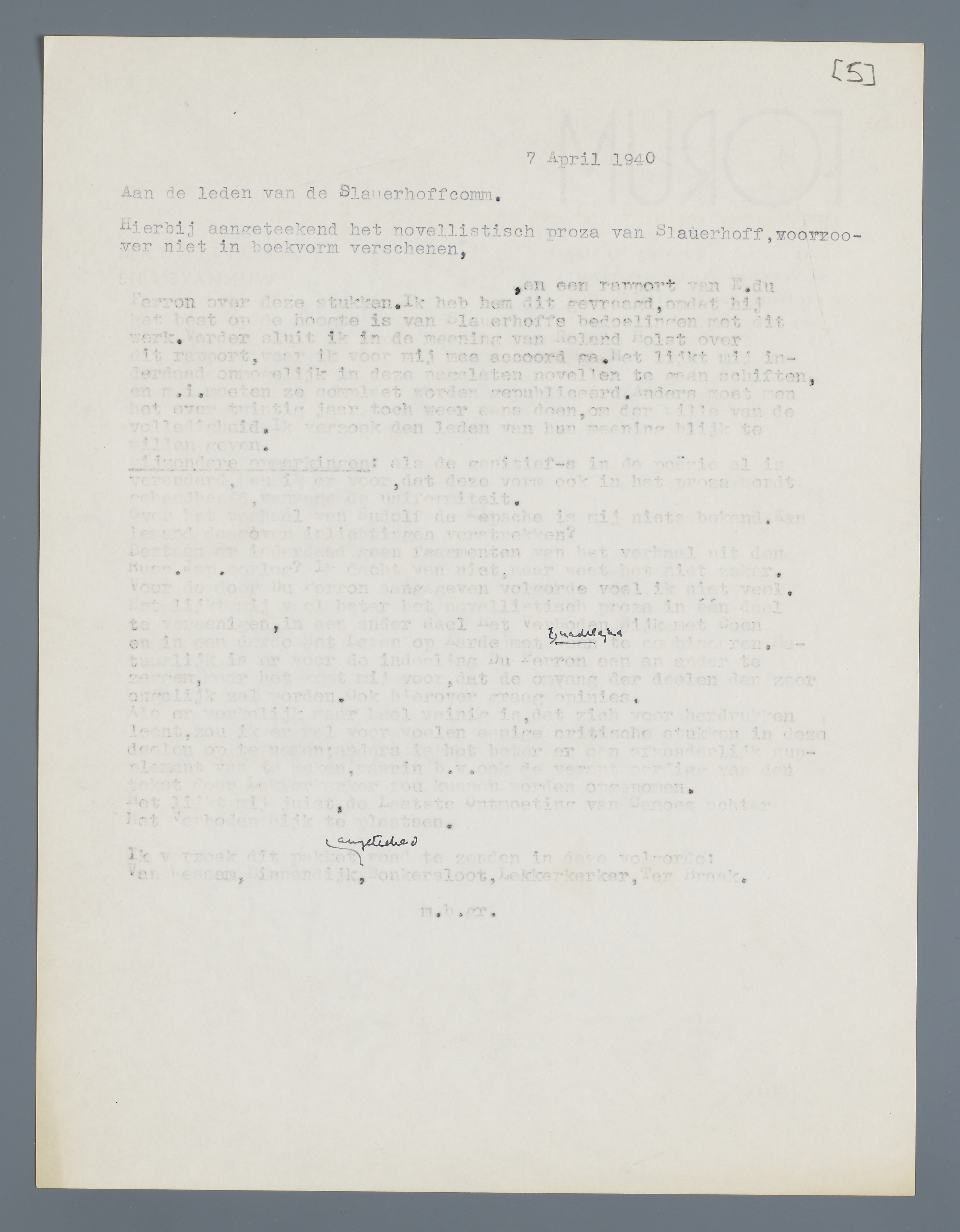 Hierbij aangeteekend het novellistisch proza van Slauerhoff, voorzoover niet in boekvorm verschenen, en een rapport van E. Du Perron over deze stukken. Ik heb hem dit gevraagd, omdat hij het best op de hoogte is van Slauerhoffs bedoelingen met dit werk. Verder sluit ik in de meening van Roland Holst over dit rapport, waar ik voor mij mee accoord ga. Het lijkt mij inderdaad onmogelijk in deze nagelaten novellen te gaan schiften, en m.i. moeten ze compleet worden gepubliceerd. Anders moet men het over twintig jaar toch weer eens doen, om der wille van de volledigheid. Ik verzoek den leden van hun meening blijk te willen geven.