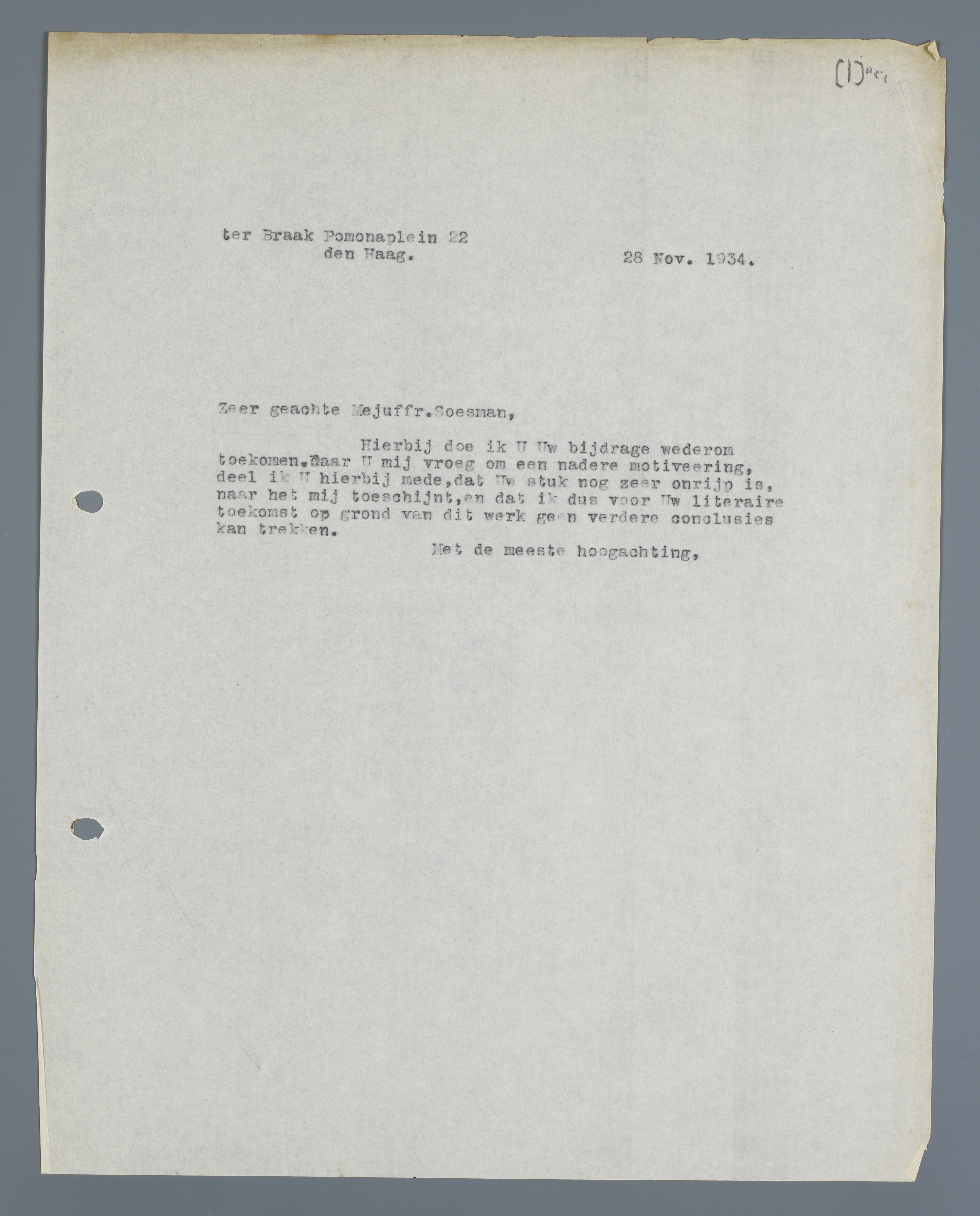 Hierbij doe ik U uw bijdrage wederom toekomen. Daar U mij vroeg om een nadere motiveering, deel ik U hierbij mede, dat Uw stuk nog zeer onrijp is, naar het mij toeschijnt, en dat ik dus voor Uw literaire toekomst op grond van dit werk geen verdere conclusies kan trekken.