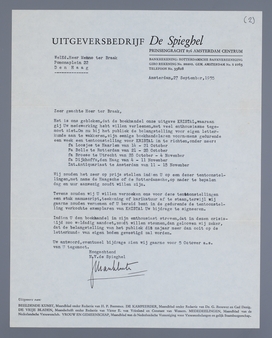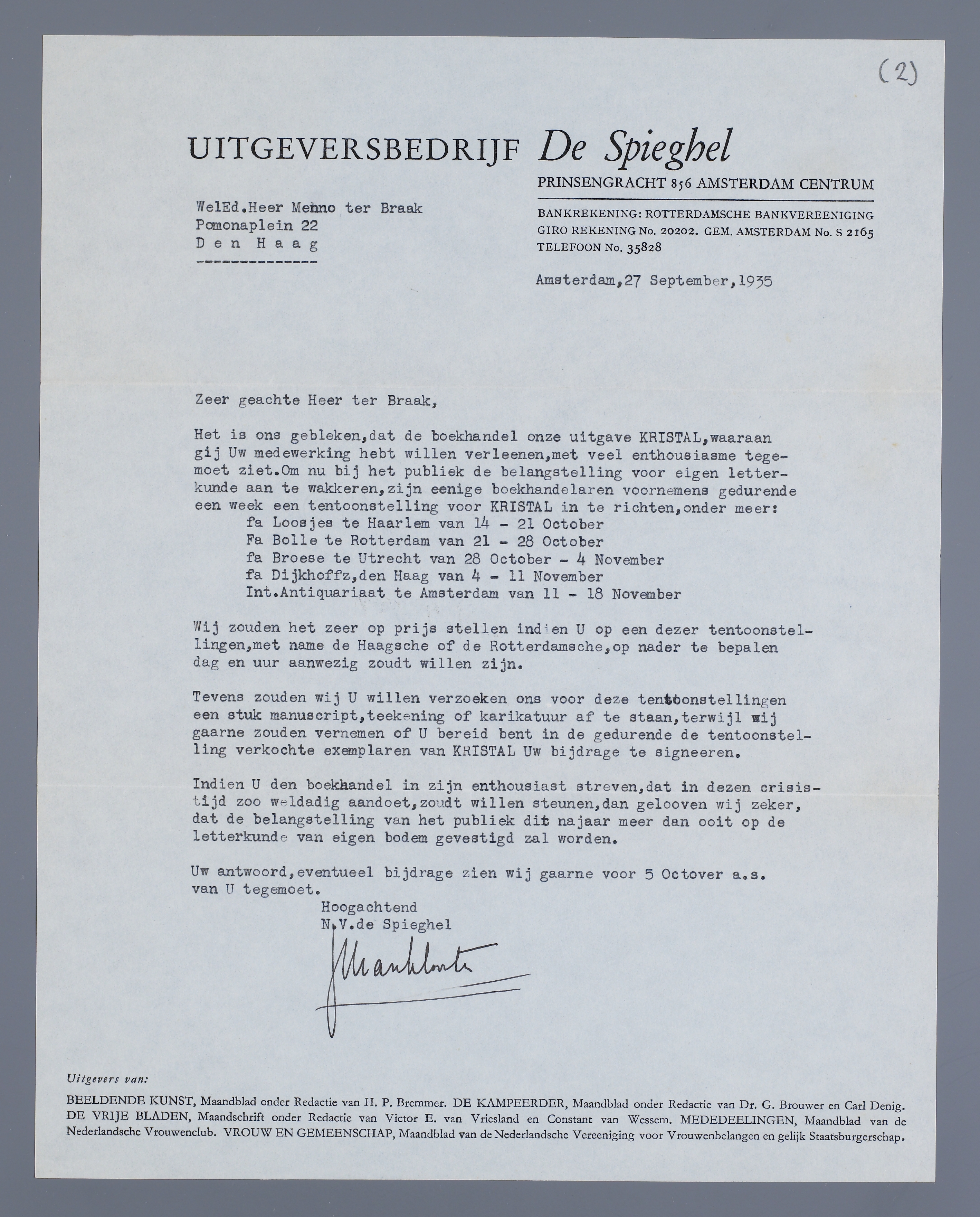 Tevens zouden wij U willen verzoeken ons voor deze tentoonstellingen een stuk manuscript, teekening of karikatuur af te staan, terwijl wij gaarne zouden vernemen of U bereid bent in de gedurende de tentoonstelling verkochte exemplaren van KRISTAL Uw bijdrage te signeeren.