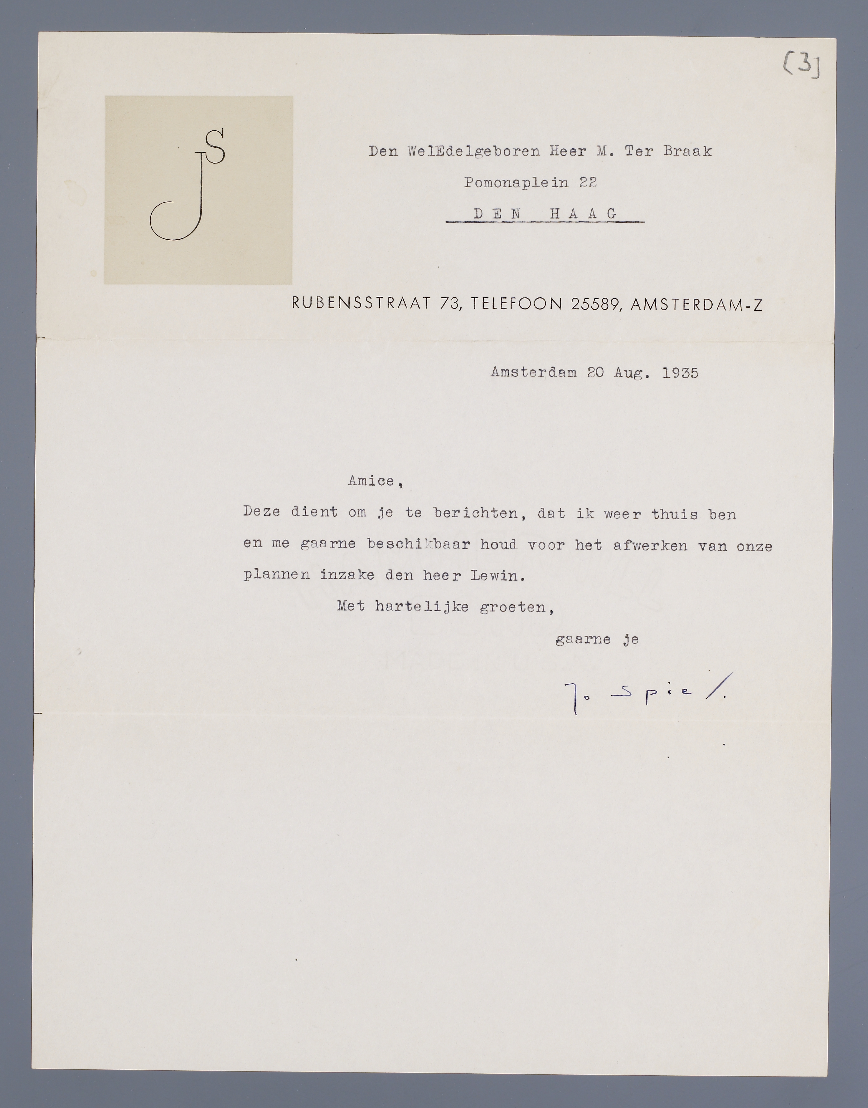 Deze dient om je te berichten, dat ik weer thuis ben en me gaarne beschikbaar houd voor het afwerken van onze plannen inzake den heer Lewin.