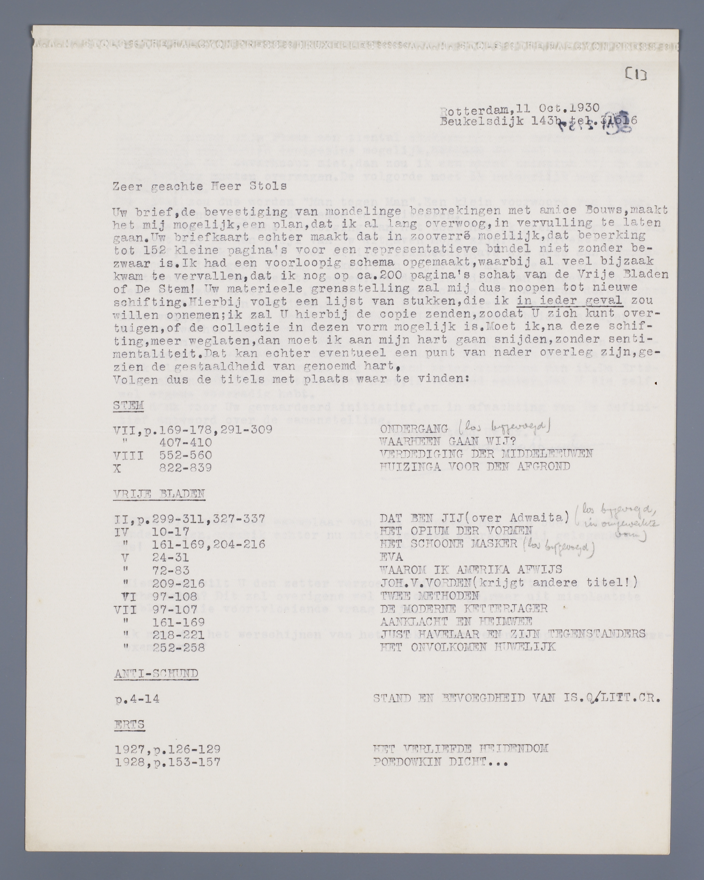 Uw brief, de bevestiging van mondelinge besprekingen met amice Bouws, maakt het mij mogelijk, een plan, dat ik al lang overwoog, in vervulling te laten gaan. Uw briefkaart echter maakt dat in zooverre moeilijk, dat beperking tot 152 kleine pagina's voor een representatieve bundel niet zonder bezwaar is. Ik had een voorloopig schema opgemaakt, waarbij al veel bijzaak kwam te vervallen, dat ik nog op ca. 200 pagina's schat van de Vrije Bladen of De Stem! Uw materieele grensstelling zal mij dus noopen tot nieuwe schifting. Hierbij volgt een lijst van stukken, die ik in ieder geval zou willen opnemen; ik zal U hierbij de copie zenden, zoodat U zich kunt overtuigen, of de collectie in dezen vorm mogelijk is. Moet ik, na deze schifting, meer weglaten, dan moet ik aan mijn hart gaan snijden, zonder sentimentaliteit. Dat kan echter een punt van nader overleg zijn, gezien de gestaaldheid van genoemd hart.