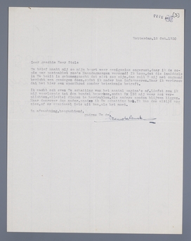 Uw brief maakt mij op mijn beurt weer eenigszins ongerust, daar ik de copie per postpakket reeds Maandagmorgen verzond! Ik hoop, dat die inmiddels in Uw bezit is gekomen; mocht dat niet zoo zijn, dan zult u mij met omgaand bericht een genoegen doen, opdat ik nader kan informeeren. Maar ik vertrouw dat het hier een oponthoud zonder beteekenis betreft.