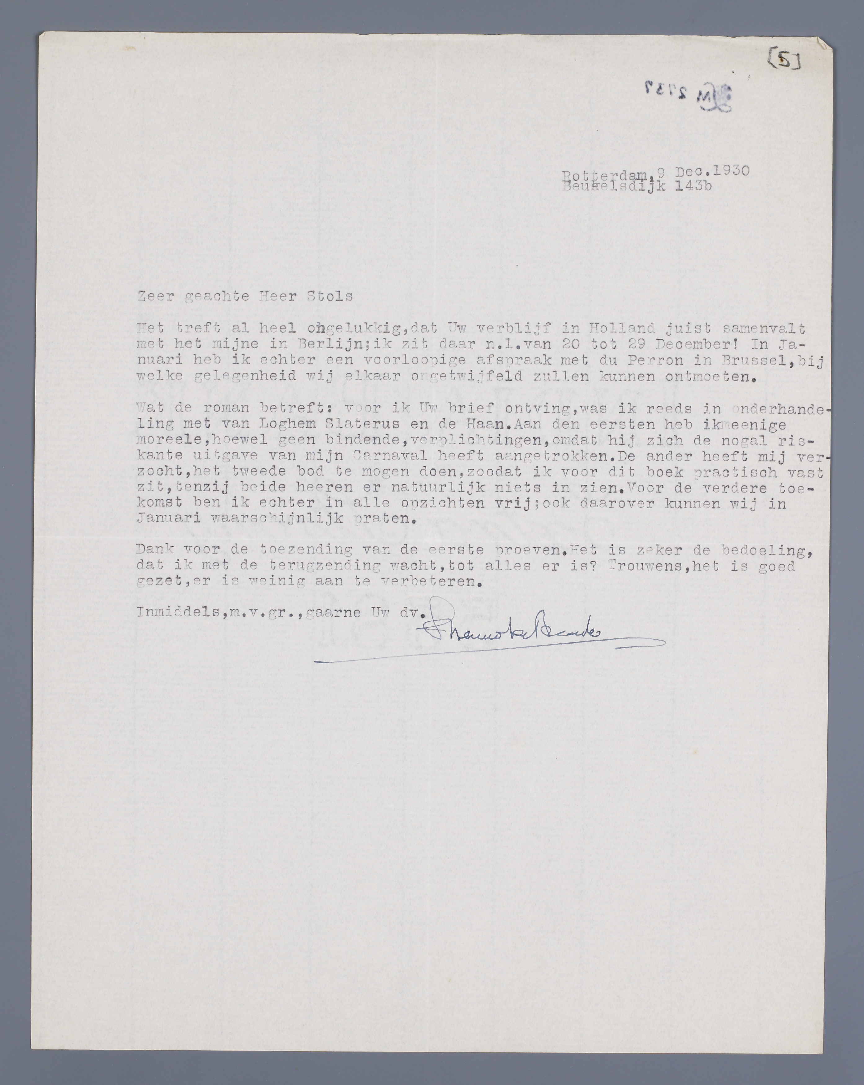 Wat de roman betreft: voor ik Uw brief ontving, was ik reeds in onderhandeling met Van Loghem Slaterus en De Haan. Aan den eersten heb ik eenige moreele, hoewel geen bindende, verplichtingen, omdat hij zich de nogal riskante uitgaven van mijn Carnaval heeft aangetrokken. De ander heeft mij verzocht, het tweede bod te mogen doen, zoodat ik voor dit boek practisch vast zit, tenzij beide heeren er natuurlijk niets in zien. Voor de de verdere toekomst ben ik echter in alle opzichten vrij; ook daarover kunnen wij in Januari waarschijnlijk praten.