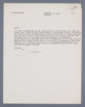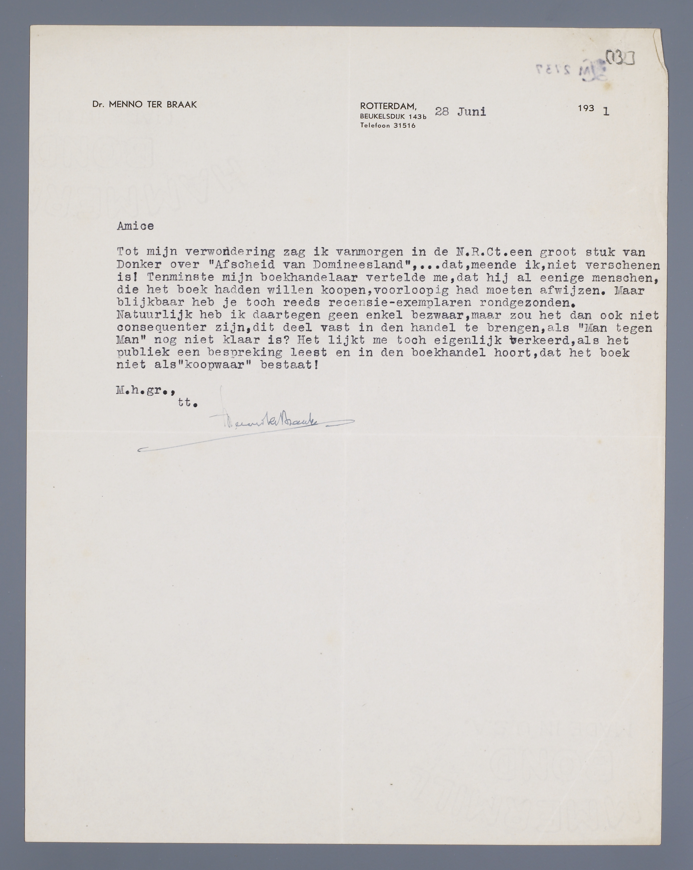 Tot mijn verwondering zag ik vanmorgen in de N.R.Ct. een groot stuk van Donker over ‘Afscheid van Domineesland’,... dat, meende ik, niet verschenen is! Tenminste mijn boekhandelaar vertelde me, dat hij al eenige menschen, die het boek hadden willen koopen, voorloopig had moeten afwijzen. Maar blijkbaar heb je toch reeds recensie-exemplaren rondgezonden.