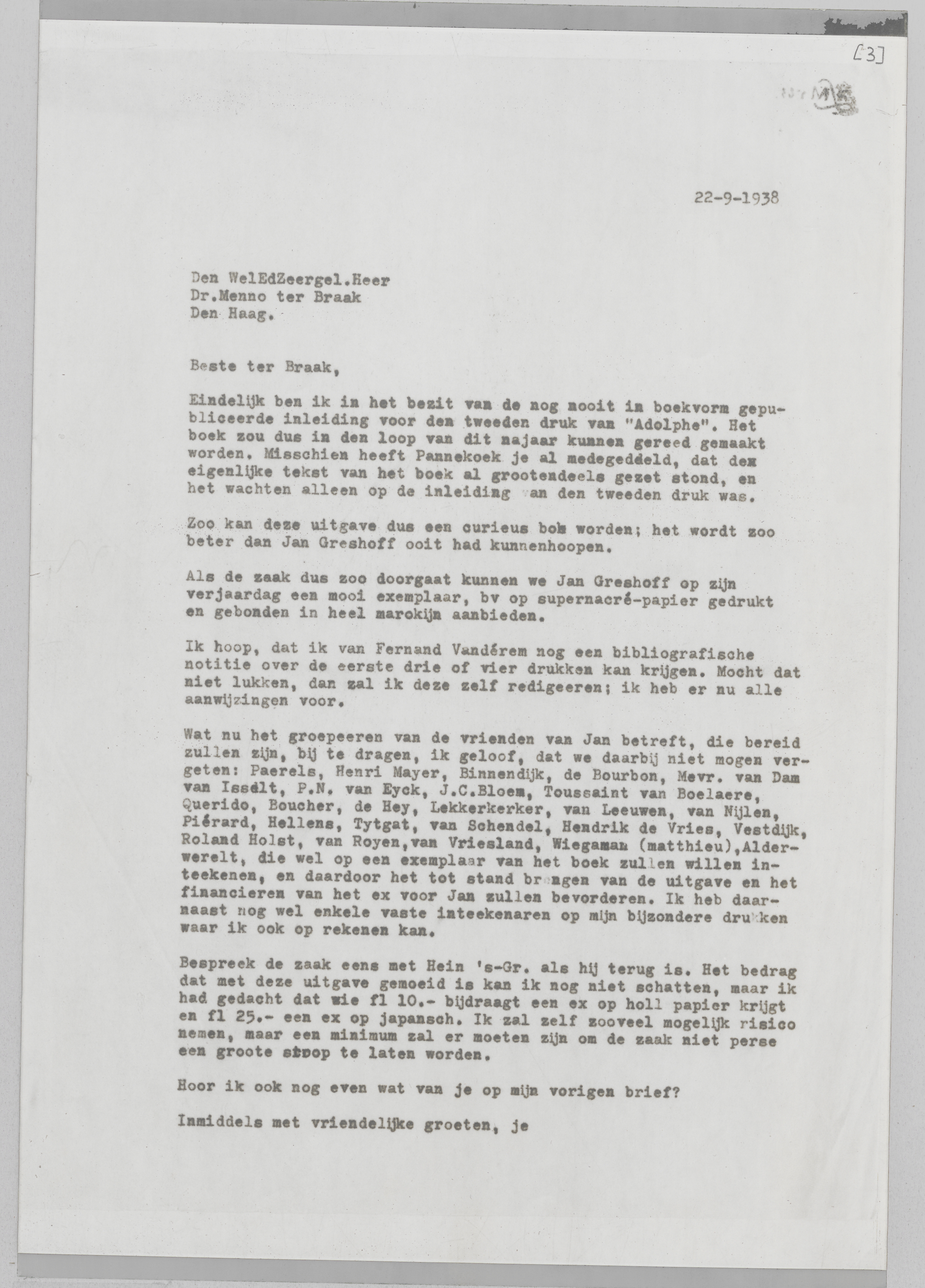 Wat nu het groepeeren van de vrienden van Jan betreft, die bereid zullen zijn, bij te dragen, ik geloof, dat we daarbij niet mogen vergeten: Paerels, Henri Mayer, Binnendijk, de Bourbon, mevr. Van Dam van Isselt, P.N. van Eyck, J.C. Bloem, Toussaint van Boelaere, Querido, Boucher, de Hey, Lekkerkerker, van Leeuwen, van Nijlen, Piérard, Hellens, Tytgat, van Schendel, Hendrik de Vries, Vestdijk, Roland Holst, van Royen, van Vriesland, Wiegman (matthieu), Alderwerelt, die wel op een exemplaar van het boek zullen willen inteekenen, en daardoor het tot stand brengen van de uitgave en het financieren van het ex voor Jan zullen bevorderen. Ik heb daarnaast nog wel enkele vaste inteekenaren op mijn bijzondere drukken waar ik ook op rekenen kan.