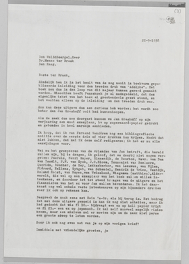 Bespreek de zaak eens met Hein 's-Gr. als hij terug is. Het bedrag dat met deze uitgave gemoeid is kan ik nog niet schatten, maar ik had gedacht dat wie fl 10.- bijdraagt een ex op holl papier krijgt en fl 25.- een ex op japansch. Ik zal zelf zooveel mogelijk risico nemen, maar een minimum zal er moeten zijn om de zaak niet perse een groote strop te laten worden.