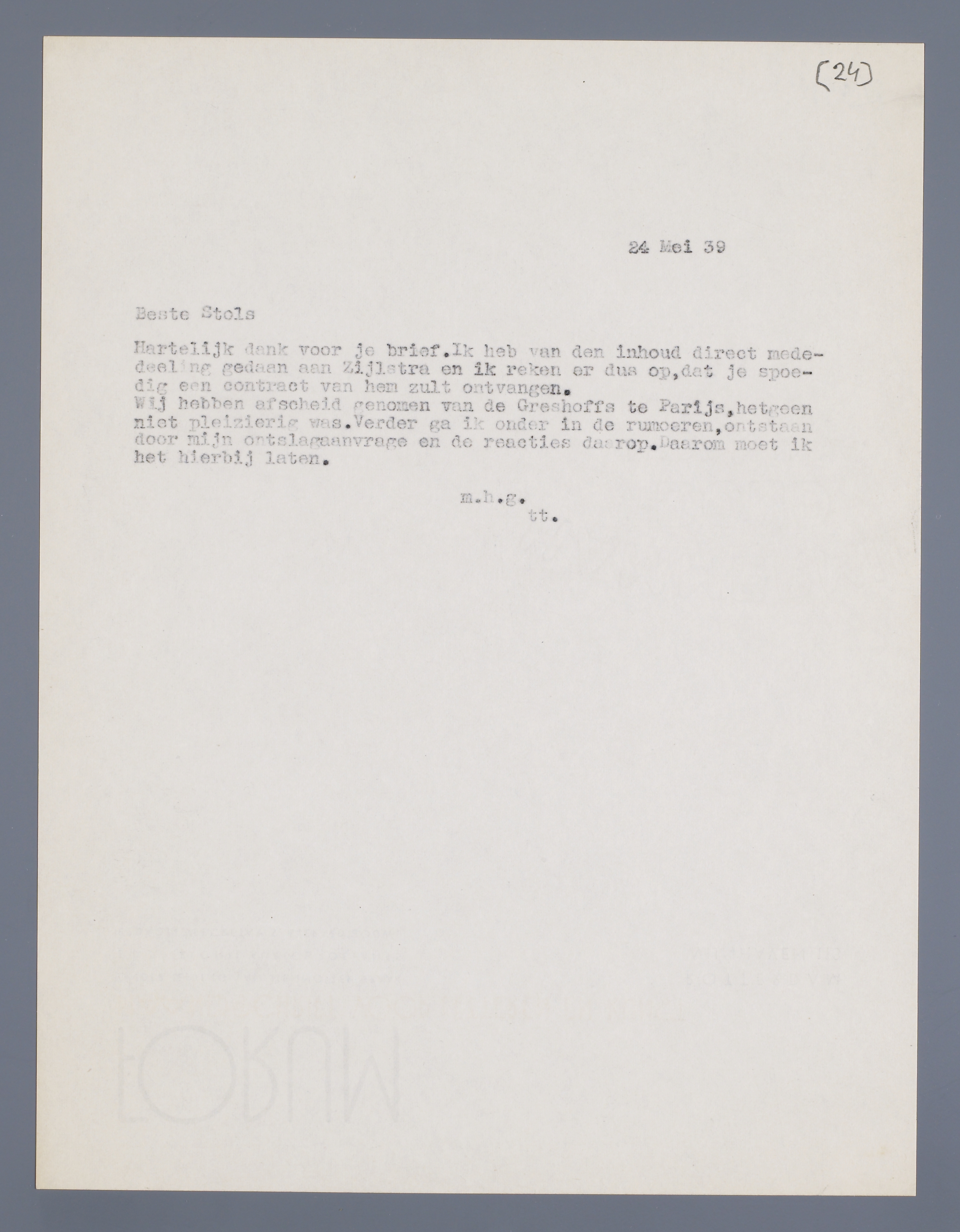 Wij hebben afscheid genomen van de Greshoffs te Parijs, hetgeen niet pleizierig was. Verder ga ik nu onder in de rumoeren, ontstaan door mijn ontslagaanvrage en de reacties daarop. Daarom moet ik het hierbij laten.