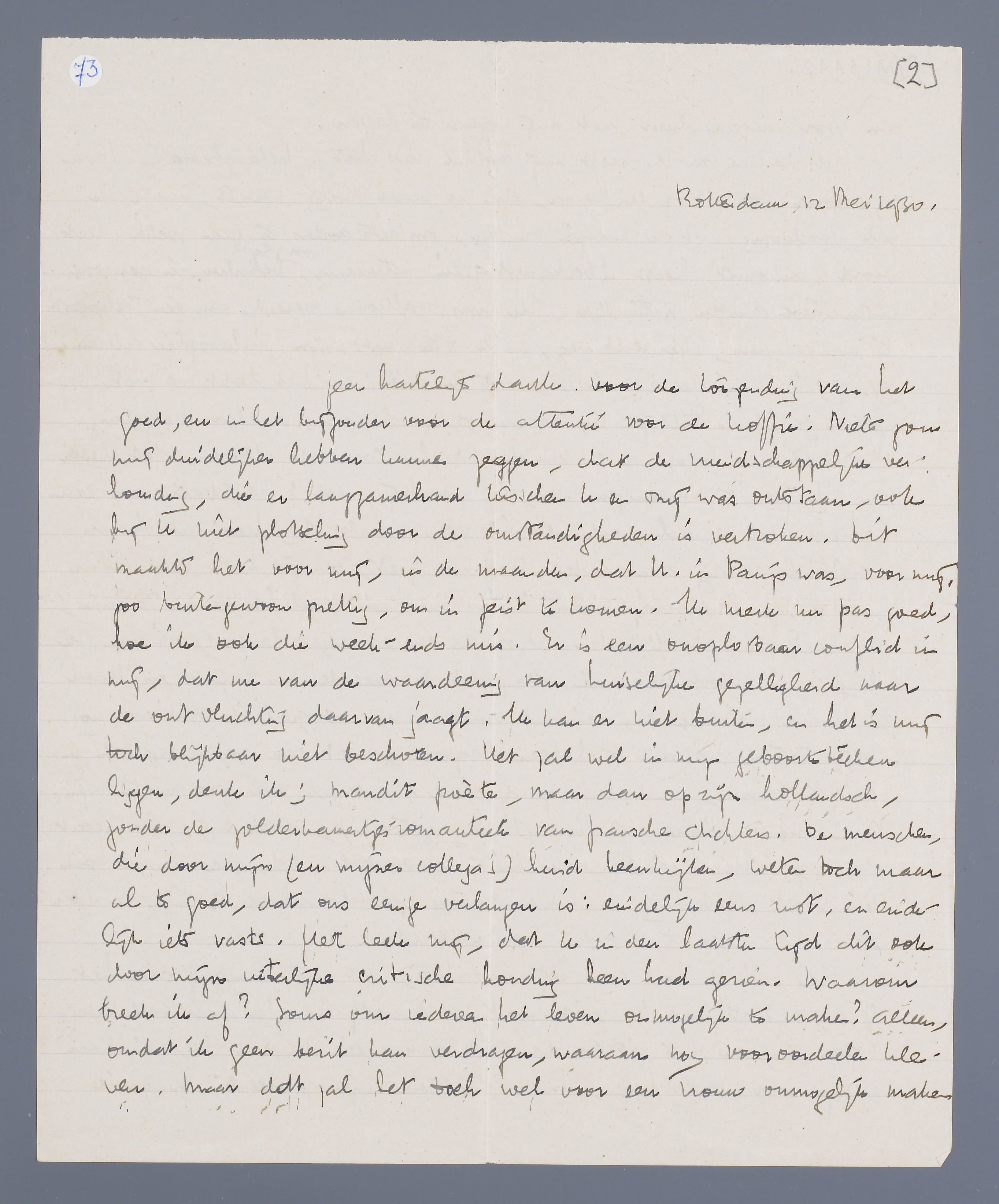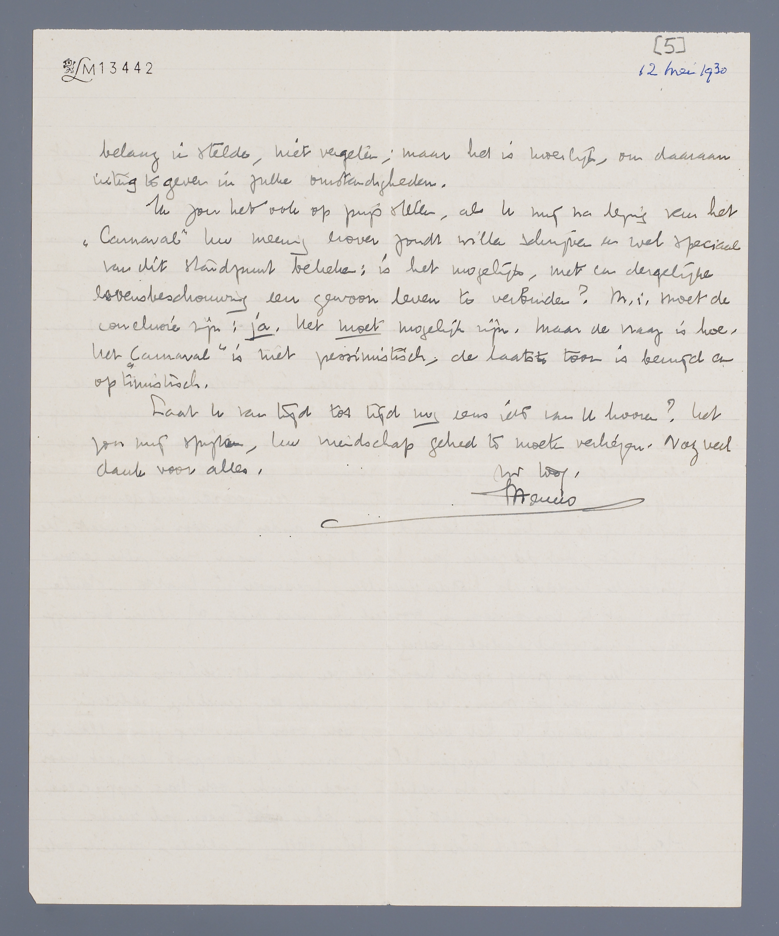 Ik zou het ook op prijs stellen, als U mij na lezing van het ‘Carnaval’ Uw meening erover zoudt willen schrijven en wel speciaal van dit standpunt bekeken: is het mogelijk, met een dergelijke levensbeschouwing een gewoon leven te verbinden? M.i. moet de conclusie zijn: ja. Het moet mogelijk zijn, maar de vraag is hoe. Het ‘Carnaval’ is niet pessimistisch, de laatste toon is bevrijd en optimistisch.