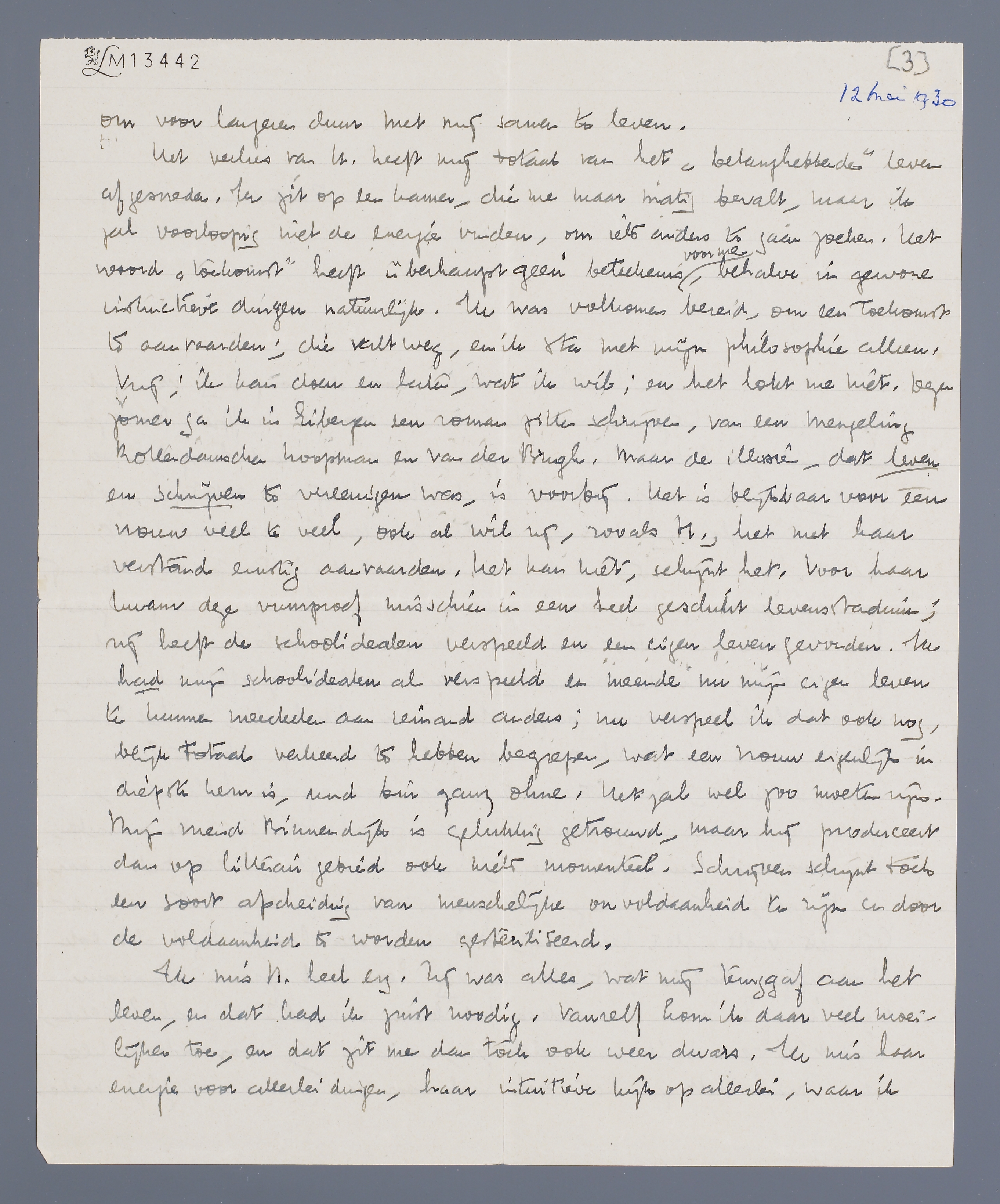 Het verlies van H. heeft mij totaal van het ‘belanghebbende’ leven afgesneden. Ik zit op een kamer, die me maar matig bevalt, maar ik zal voorloopig niet de energie vinden, om iets anders te gaan zoeken. Het woord ‘toekomst’ heeft überhaupt geen beteekenis voor me, behalve in gewone instinctieve dingen natuurlijk. Ik was volkomen bereid, om een toekomst te aanvaarden; die valt weg, en ik sta met mijn philosophie alleen. Vrij, ik kan doen en laten, wat ik wil; en het lokt me niet. Dezen zomer ga ik in Eibergen een roman zitten schrijven, van een mengeling Rotterdamsche koopman en van der Brugh. Maar de illusie, dat leven en schrijven te vereenigen was, is voorbij. Het is blijkbaar voor een vrouw veel te veel, ook al wil zij, zooals H., het met haar verstand ernstig aanvaarden. Het kan niet, schijnt het. Voor haar kwam deze vuurproef misschien in een heel geschikt levensstadium; zij heeft de schoolidealen verspeeld en een eigen leven gevonden. Ik had mijn schoolidealen al verspeeld en meende nu mijn eigen leven te kunnen meedeelen aan iemand anders; nu verspeel ik dat ook nog, blijk totaal verkeerd te hebben begrepen, wat een vrouw eigenlijk in diepste kern is, und bin ganz ohne. Het zal wel zoo moeten zijn. Mijn vriend Binnendijk is gelukkig getrouwd, maar hij produceert dan op litterair gebied ook niets momenteel. Schrijven schijnt toch een soort afscheiding van menschelijke onvoldaanheid te zijn en door de voldaanheid te worden gesteriliseerd.