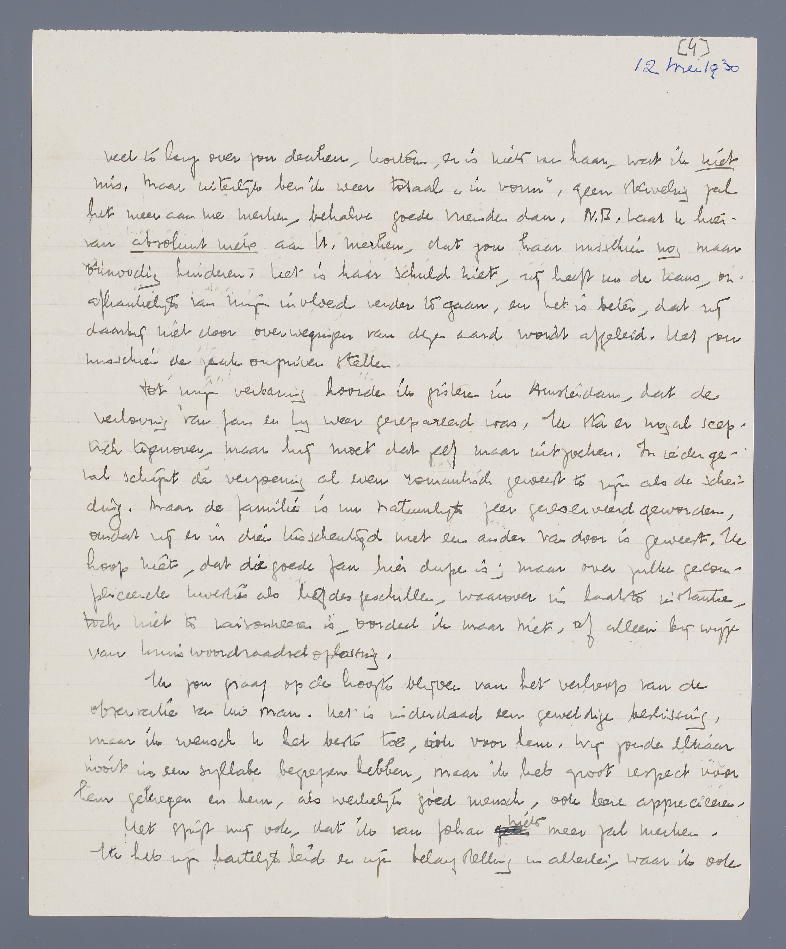 Ik zou graag op de hoogte blijven van het verloop van de observatie van uw man. Het is inderdaad een geweldige beslissing, maar ik wensch u het beste toe, ook voor hem. Wij zouden elkaar nooit in een syllabe begrepen hebben, maar ik heb groot respect voor hem gekregen en hem, als werkelijk goed mensch, ook leeren apprecieeren. Het spijt mij ook, dat ik van Johan niets meer zal merken. Ik heb zijn hartelijkheid en zijn belangstelling in allerlei, waar ik ook belang in stelde, niet vergeten; maar het is moeilijk, om daaraan uiting te geven in zulke omstandigheden.