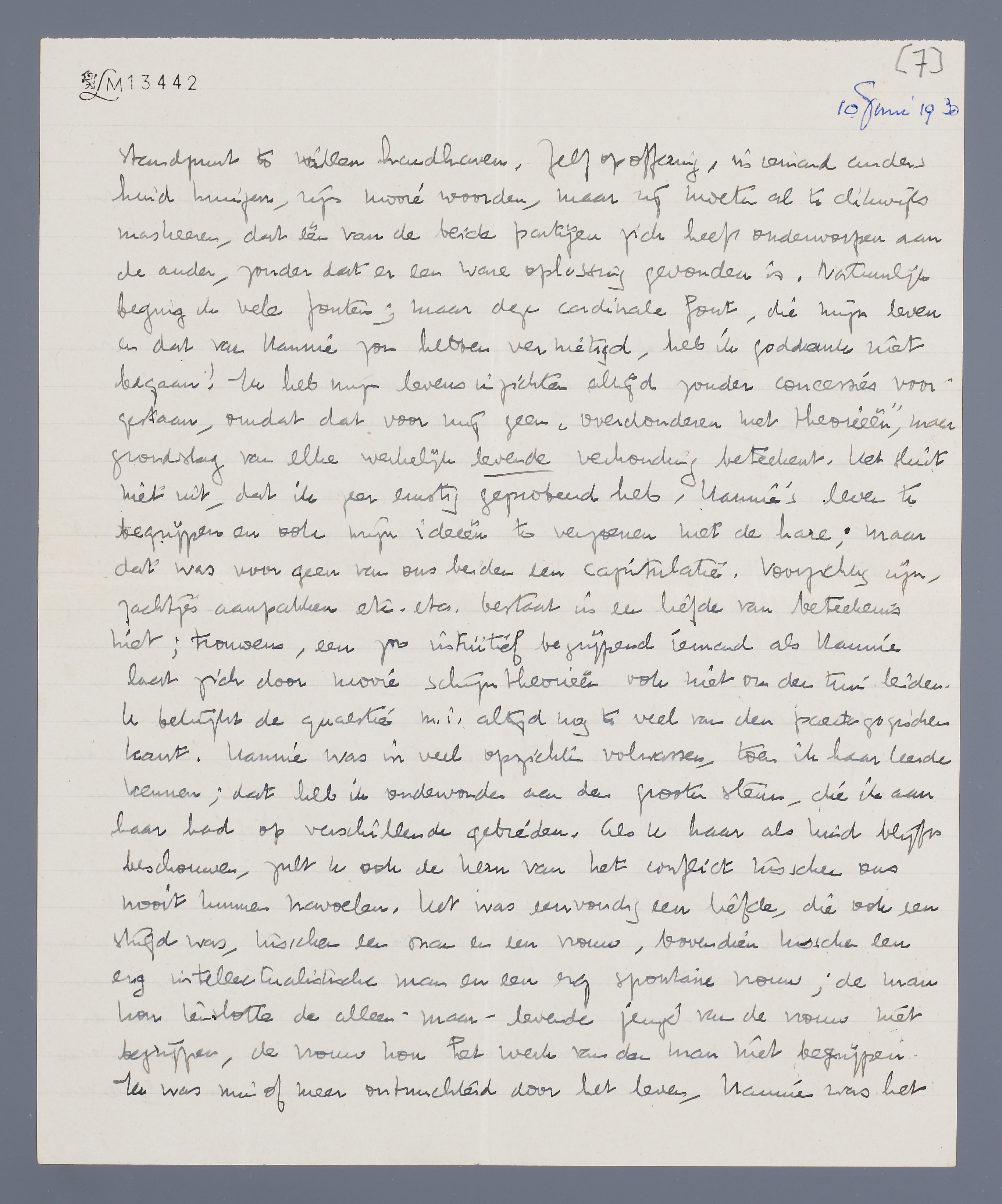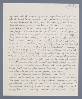 Van Uw brief, die ik zeer gewaardeerd heb, maak ik graag eens gebruik, om nog enkele dingen nader toe te lichten, die U misschien nog onbegrijpelijk voorkomen. Ik merk uit Uw manier van schrijven, dat U mij niet alleen als de schoonzoon hebt beschouwd, maar ook nog als mensch, en dat dus het verdwijnen van de schoonzoon voor den mensch geen consequenties heeft. Het doet mij veel goed, dat te weten; wij hebben te vaak prettig en werkelijk zonder de gewone voorwendsels samen gepraat, om ons plotseling geheel uit elkaars gezichtskring te verdwijnen. Toch meen ik, dat U nog altijd de dingen te weinig gecompliceerd ziet. U verwonderd er U n.l. over, dat ik wel ‘blind leek’ voor Hannie's wijze van reageeren op mijn theorieën. Dat is niet juist, ik was daarvoor volstrekt niet blind, ik zag het voortdurend, maar ik meende alleen, dat het oplosbaar zou zijn. Daarin heb ik mij vergist, maar U vergeet één ding: de verhouding tusschen man en vrouw is niet paedagogisch. Een man, die werkelijk van een vrouw houdt, gaat haar niet opvoeden met de geduldige kalmte van ouders tegenover hun kinderen. Hij tracht haar in te wijden in zijn leven; maar opvoeden noem ik in dit geval een bedrieglijke illusie. Een verhouding als deze is een soort gevecht, om samen te kunnen leven. Daarbij behoeft men volstrekt niet egocentrisch te zijn, om toch eigen standpunt te willen handhaven. Zelfopoffering, in iemand anders huid kruipen, zijn mooie woorden, maar zij moeten al te dikwijls maskeeren, dat één van de beide partijen zich heeft onderworpen aan de ander, zonder dat er een ware oplossing gevonden is. Natuurlijk beging ik vele fouten; maar deze cardinale fout, die mijn leven en dat van Hannie zou hebben vernietigd, heb ik goddank niet begaan! Ik heb mijn levensinzichten altijd zonder concessies voorgestaan, omdat dat voor mij geen ‘overdonderen met theorieën’, maar grondslag van elke werkelijk levende verhouding beteekent. Het sluit niet uit, dat ik zeer ernstig geprobeerd heb, Hannie's leven te begrijpen en ook mijn ideeën te verzoenen met de hare: maar dat was voor geen van ons beiden een capitulatie. Voorzichtig zijn, zachtjes aanpakken etc. etc. bestaat in een liefde van beteekenis niet; trouwens, een zoo intuïtief begrijpend iemand als Hannie laat zich door mooie schijntheorieën ook niet om den tuin leiden. U bekijkt de questie m.i. altijd nog te veel van de paedagogische kant. Hannie was in veel opzichten volwassen, toen ik haar leerde kennen; dat heb ik ondervonden aan den grooten steun, die ik aan haar had op verschillende gebieden. Als U haar als kind blijft beschouwen, zult U ook de kern van het conflict tusschen ons nooit kunnen navoelen. Het was eenvoudig een liefde, die ook een strijd was, tusschen een man en een vrouw, bovendien tusschen een erg intellectualistische man en een erg spontane vrouw; de man kon tenslotte de alleen-maar-levende jeugd van de vrouw niet begrijpen, de vrouw kon het werk van den man niet begrijpen. Ik was min of meer ontnuchterd door het leven, Hannie was het nog niet, ook al probeerde zij het om mijnentwille wel te zijn, en ook al trachtte ik om harentwille weer zoo eenvoudig mogelijk te zijn. Ik was heelemaal niet blind, maar ik moest zijn, zooals ik was, tout simplement, want anders had ik toch ook immers voor Hannie geen beteekenis! Dacht u soms, dat zij van een paedagogische, voorzichtigen, simuleerend-eenvoudige minnaar zou hebben gehouden? Nee, zij hield van mij, zooals ik was; maar na haar verblijf in Parijs, bleek de oorspronkelijke levenslust zich weer te hebben geconcentreerd, en daarin hoorde ik niet meer thuis. Ik geloof ook niet, dat ik er weer in thuis zal hooren, voor zij dezelfde duw van het leven heeft gekregen als ik. Die duw krijgt iedereen, die ‘dichterlijk’ is aangelegd, dus niet bij leugen zweert. Misschien zal het blijken, dat zij teveel van haar vaders natuur heeft; maar anders krijgt zij ook, vroeg of laat, de schok, die je zoo kaal achterlaat in deze gewichtige wereld als een pasgebooren kind. Ik geloof niet, dat ik samen zal kunnen leven met iemand, die dat moment niet heeft gekend; of het moest zijn een complete winkeljuffrouw, die van de problemen des geestes niet weet, en alleen maar ‘Hane schatz’ kan zijn. Dat is voor velen óók een (zij het dan poovere) oplossing.