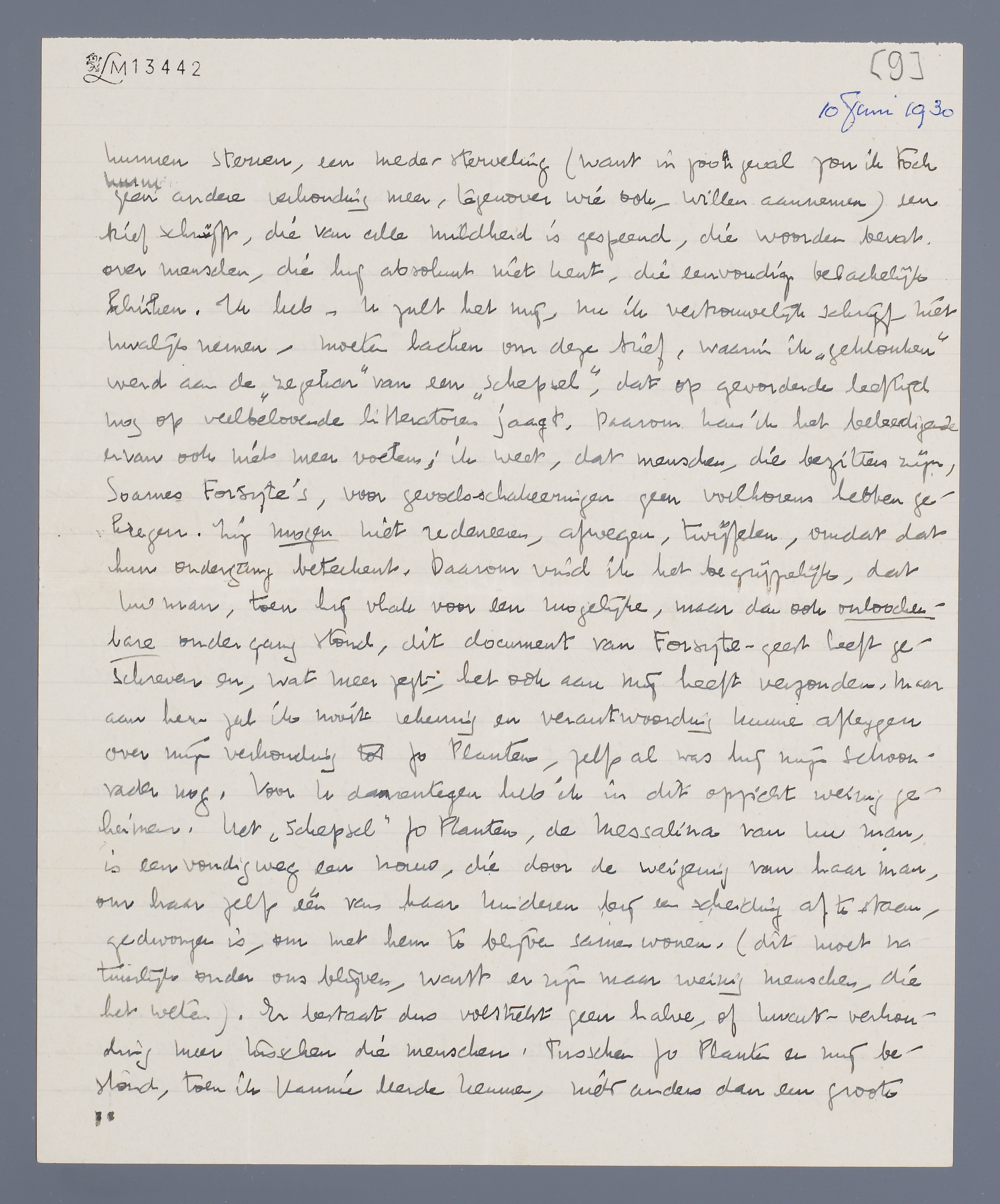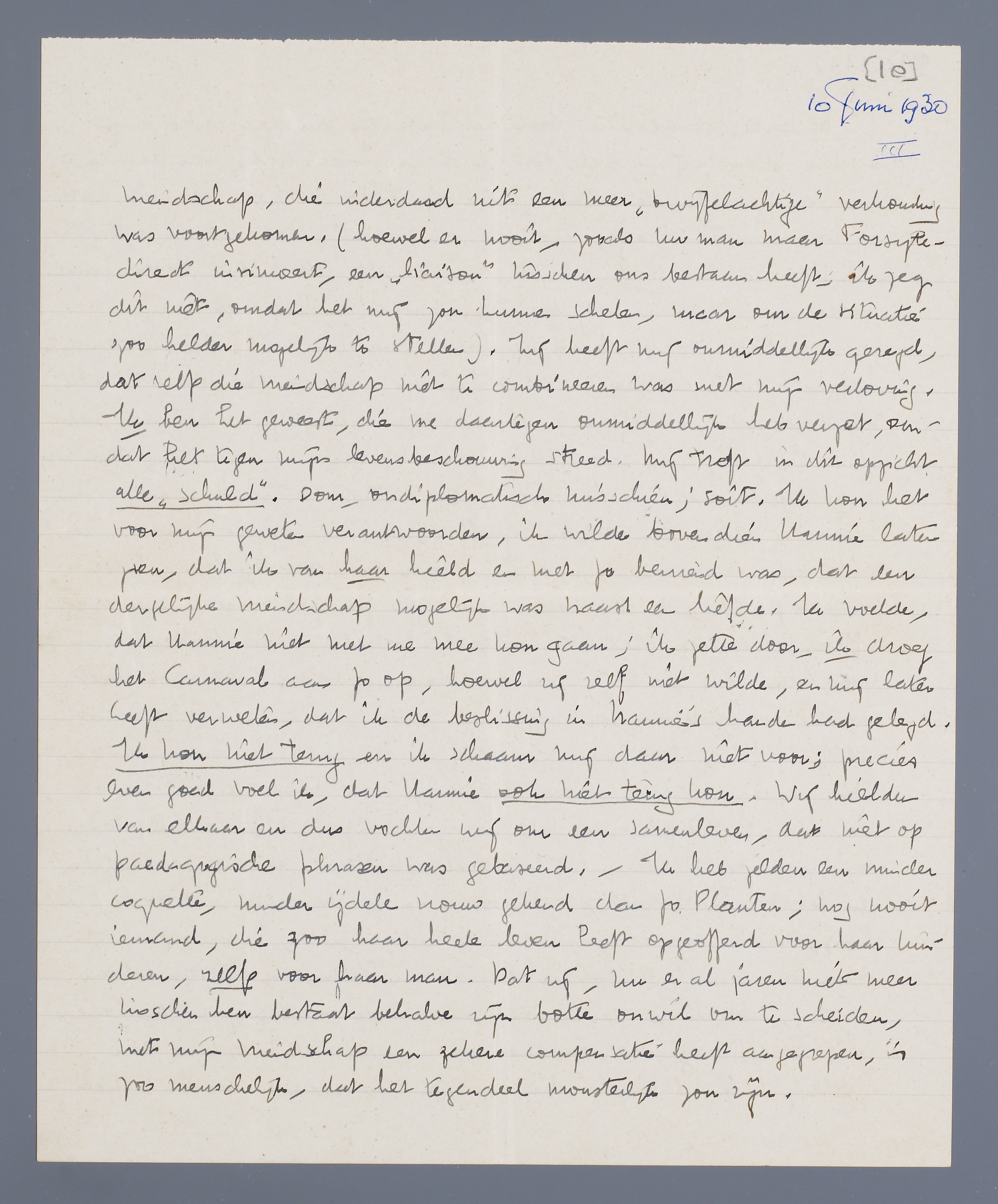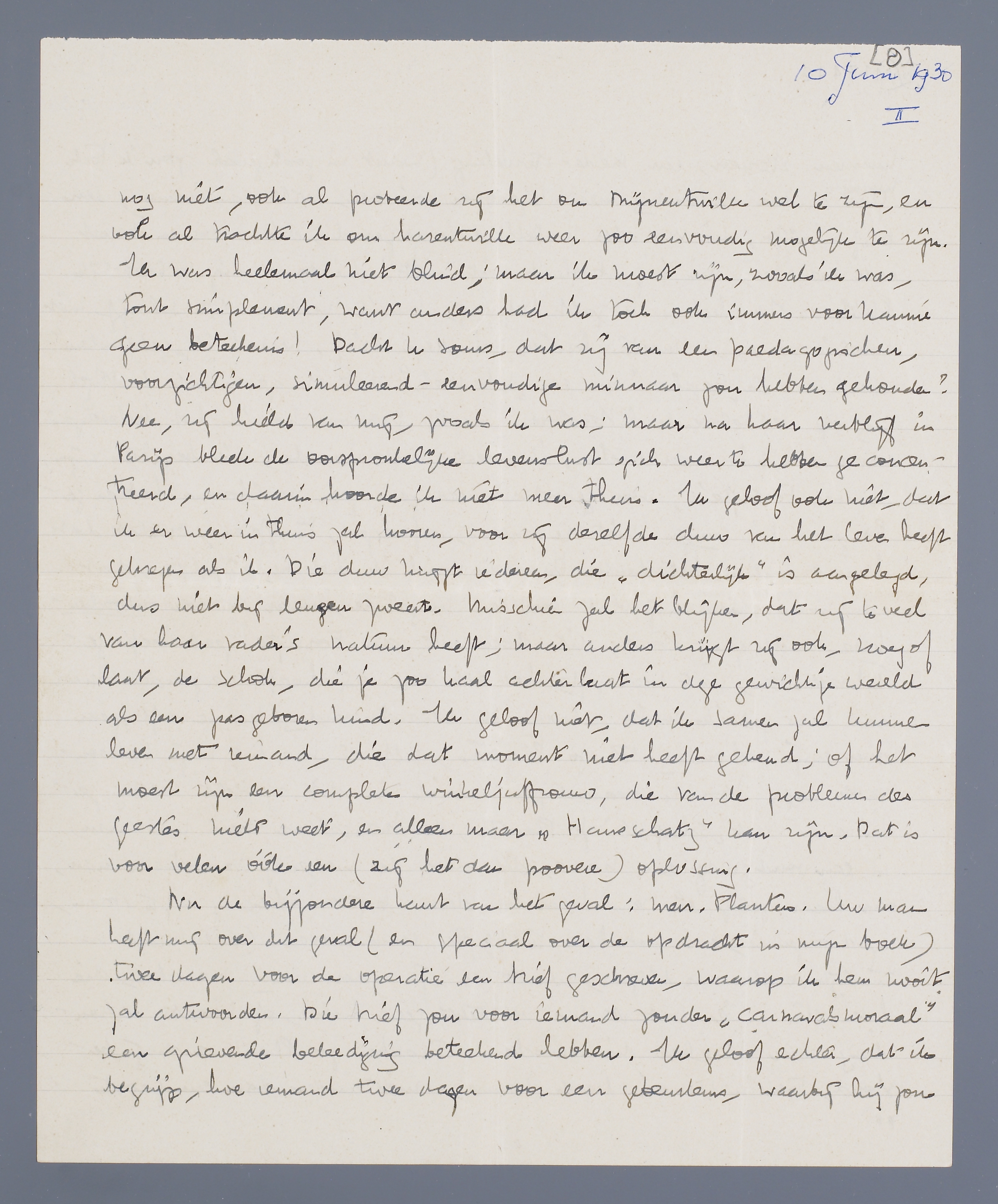 Nu de bijzondere kant van het geval. Mevr. Planten. Uw man heeft mij over dit geval (en speciaal over de opdracht in mijn boek) twee dagen voor de operatie een brief geschreven, waarop ik hem nooit zal antwoorden. Die brief zou voor iemand zonder ‘carnavalsmoraal’ een grievende beleediging beteekend hebben. Ik geloof echter, dat ik begrijp, hoe iemand twee dagen voor een gebeurtenis, waarbij hij zou kunnen sterven, een mede-sterveling (want in zoo'n geval zou ik toch geen andere verhouding meer, tegenover wie ook, willen aannemen) een brief schrijft, die van alle mildheid is gespeend, die woorden bevat over menschen, die hij absoluut niet kent, die eenvoudig belachelijk klinken. Ik heb - U zult het mij, nu ik vertrouwelijk schrijf, niet kwalijk nemen - moeten lachen om deze brief, waarin ik ‘geklonken’ werd aan de ‘zegekar’ van een ‘schepsel’, dat op gevorderde leeftijd nog op veelbelovende litteratoren jaagt. Daarom kan ik het beleedigende ervan ook niet meer voelen; ik weet, dat menschen, die bezitters zijn, Soames Forsyte's, voor gevoelsschakeeringen geen voelhorens hebben gekregen. Zij mogen niet redeneeren, afwegen, twijfelen, omdat dat hun ondergang beteekent. Daarom vind ik het begrijpelijk, dat Uw man, toen hij vlak voor een mogelijke, maar dan ook onloochenbare ondergang stond, dit document van Forsyte-geest heeft geschreven en, wat meer zegt: het ook aan mij heeft verzonden. Maar aan hem zal ik nooit rekening en verantwoording kunnen afleggen over mijn verhouding tot Jo Planten, zelfs al was hij mijn schoonvader nog. Voor U daarentegen heb ik in dit opzicht weinig geheimen. Het ‘schepsel’ Jo Planten, de Messalina van Uw man, is eenvoudigweg een vrouw, die door de weigering van haar man, om haar zelfs één van haar kinderen bij een scheiding af te staan, gedwongen is, om met hem te blijven samenwonen. (Dit moet natuurlijk onder ons blijven, want er zijn maar weinig menschen, die het weten). Er bestaat dus volstrekt geen halve, of kwart-verhouding meer tusschen die menschen. Tusschen Jo Planten en mij bestond, toen ik Hannie leerde kennen, niets anders dan een groote vriendschap, die inderdaad uit een meer ‘twijfelachtige’ verhouding was voortgekomen. (Hoewel er nooit, zooals Uw man maar Forsyte-direct insinueert, een ‘liaison’ tusschen ons bestaan heeft; ik zeg dit niet, omdat het mij zou kunnen schelen, maar om de situatie zoo helder mogelijk te stellen). Zij heeft mij onmiddellijk gezegd, dat zelfs die vriendschap niet te combineeren was met mijn verloving. Ik ben het geweest, die me daartegen onmiddellijk heb verzet, omdat het tegen mijn levensbeschouwing streed. Mij treft in dit opzicht alle ‘schuld’. Dom, ondiplmatisch misschien; soit. Ik kon het voor mijn geweten verantwoorden, ik wilde bovendien Hannie laten zien, dat ik van haar hield en met Jo bevriend was, dat een dergelijke vriendschap mogelijk was naast een liefde. Ik voelde, dat Hannie niet met me mee kon gaan; ik zette door, ik droeg het Carnaval aan Jo op, hoewel zij zelf niet wilde, en mij later heeft verweten, dat ik de beslissing in Hannie's handen had gelegd. Ik kon niet terug en ik schaam mij daar niet voor; precies even goed voel ik, dat Hannie ook niet terug kon. Wij hielden van elkaar en dus vochten wij om een samenleven, dat niet op paedagogische phrasen was gebaseerd. - Ik heb zelden een minder coquette, minder ijdele vrouw gekend dan Jo Planten; nog nooit iemand, die zoo haar heele leven heeft opgeofferd voor haar kinderen, zelfs voor haar man. Dat zij, nu er al jaren niet meer tusschen hen bestaat behalve zijn botte onwil om te scheiden, met mijn vriendschap een zekere compensatie heeft aangegrepen, is zoo menschelijk, dat het tegendeel monsterlijk zou zijn.