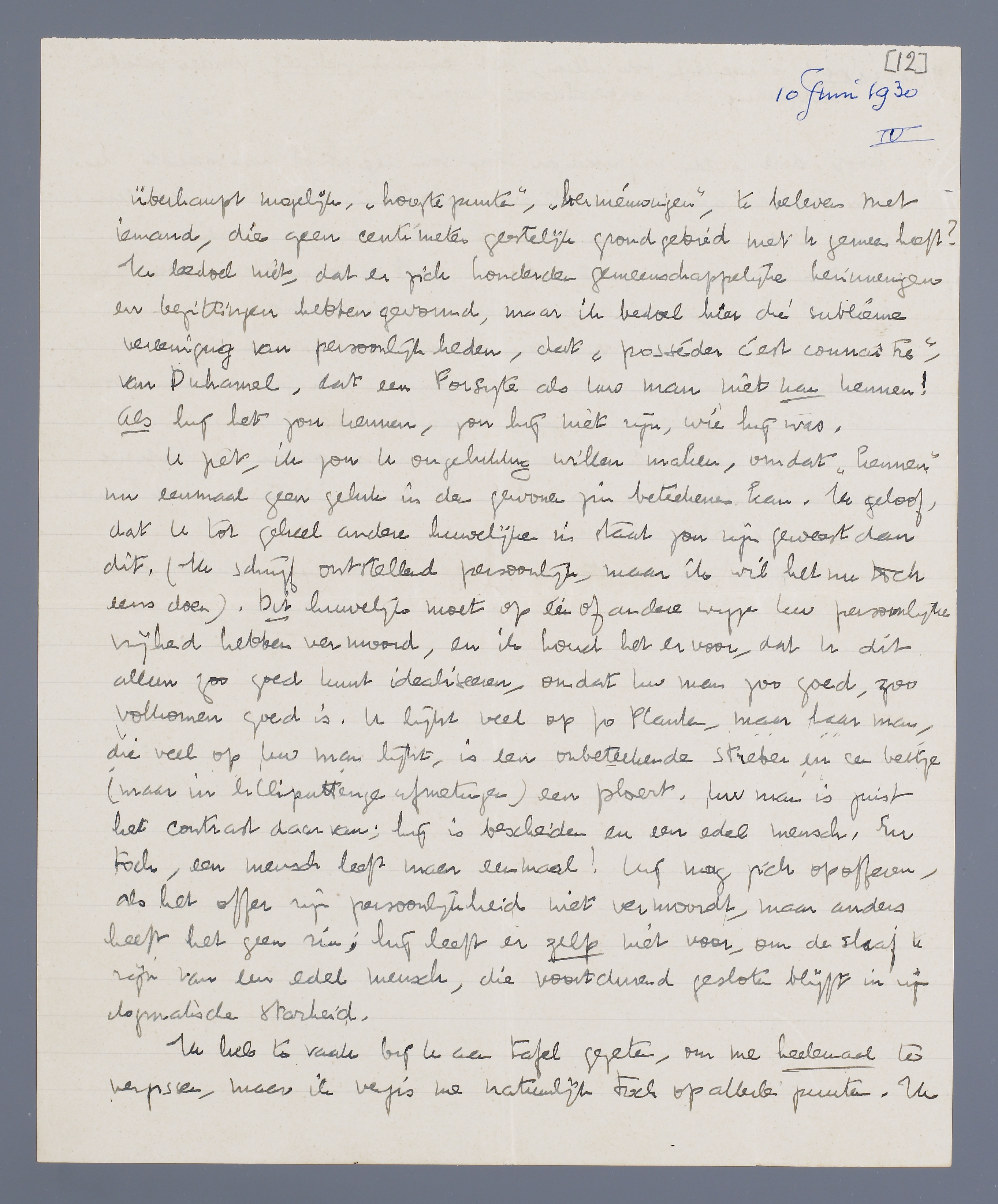 U ziet, ik zou U ongelukkig willen maken, omdat ‘kennen’ nu eenmaal geen geluk in den gewone zin beteekenen kan. Ik geloof, dat U tot geheel andere huwelijken in staat zou zijn geweest dan dit. (Ik schrijf ontstellend persoonlijk, maar ik wil het nu toch eens doen). Dit huwelijk moet op de een of andere wijze Uw persoonlijke vrijheid hebben vermoord, en ik houd het er voor, dat U dit alleen zoo goed kunt idealiseeren, omdat Uw man zoo goed, zoo volkomen goed is. U lijkt veel op Jo Planten, maar haar man, die veel op Uw man lijkt, is een ontbeteekende streber, en een beetje (maar in lilliputterige afmetingen) een ploert. Uw man is juist het contrast daarvan; hij is bescheiden en een edel mensch. En toch, een mensch leeft maar eenmaal! Hij mag zich opofferen, als het offer zijn persoonlijkheid niet vermoordt, maar anders heeft het geen zin; hij leeft er zelfs niet voor, om den slaaf te zijn van een edel mensch, die voortdurend gesloten blijft in zijn dogmatische starheid.