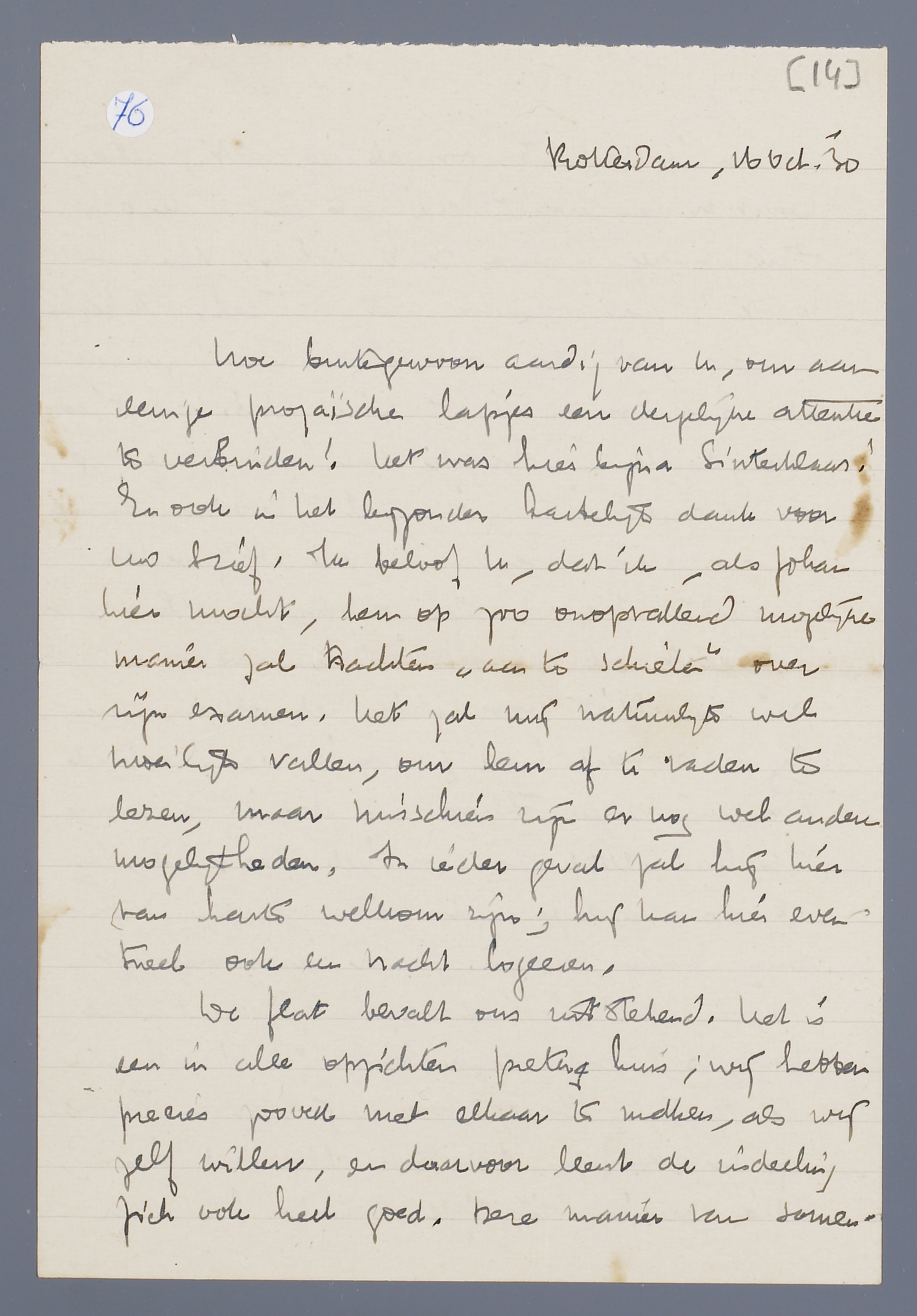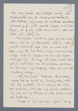 Hoe buitengewoon aardig van U om aan eenige prozaïschen lapjes een dergelijke attentie te verbinden! Het was hier bijna Sinterklaas. En ook in het bijzonder hartelijk dank voor Uw brief. Ik beloof U, dat ik, als Johan hier mocht, hem op zoo onopvallend mogelijke manier zal trachten ‘aan te schieten’ over zijn examen. Het zal mij natuurlijk wel moeilijk vallen, om hem af te raden te lezen, maar misschien zijn er nog wel andere mogelijkkheden. In ieder geval zal hij hier van harte welkom zijn; hij kan hier eventueel ook een nacht logeeren.