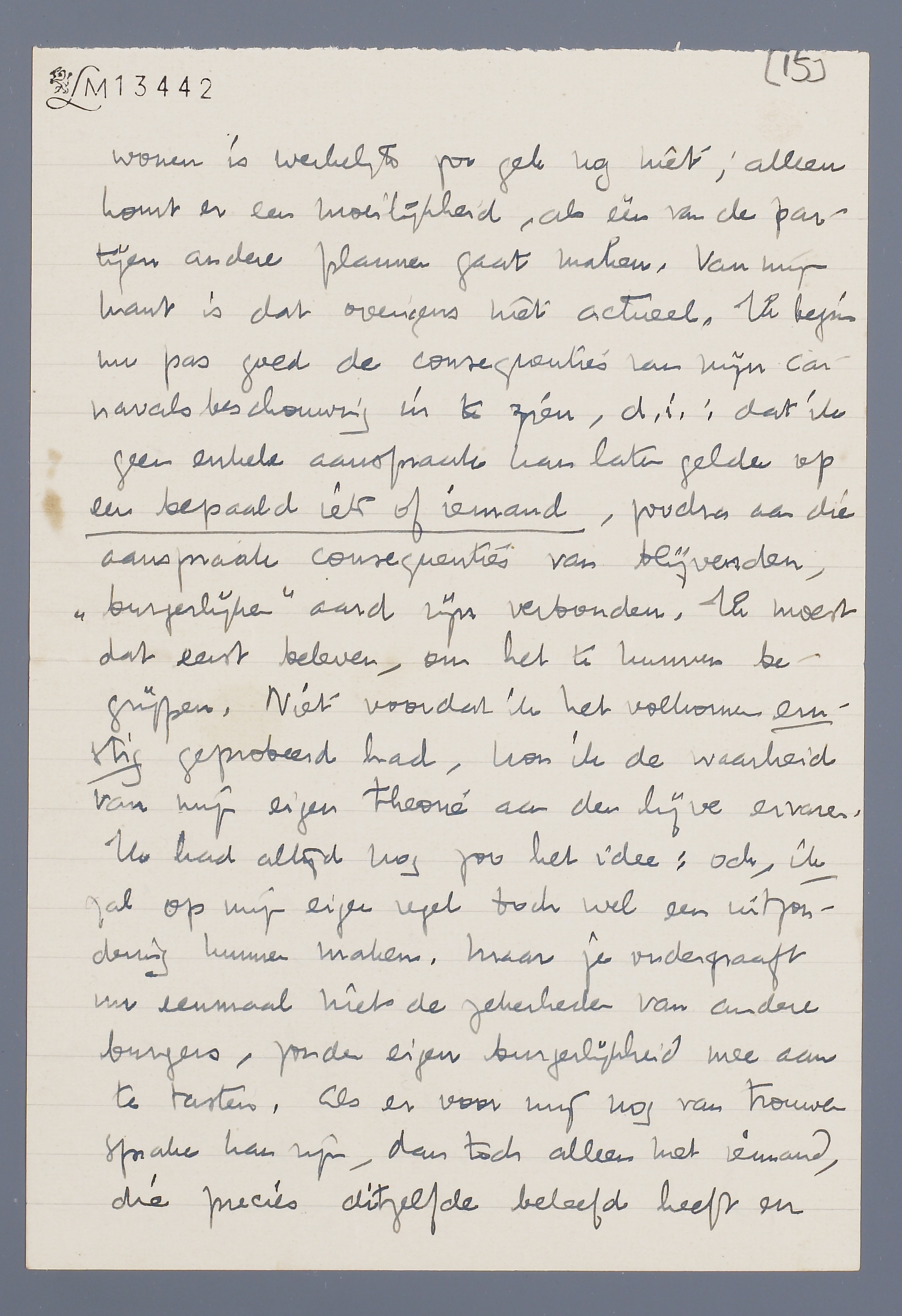 De flat bevalt ons uitstekend. Het is een in alle opzichten prettig huis; wij hebben precies zooveel met elkaar te maken, als wij zelf willen, en daarvoor leent de indeeling zich ook heel goed. Deze manier van samenwonen is werkelijk zoo gek nog niet; alleen komt er een moeilijkheid, als één van de partijen andere plannen gaat maken. Van mijn kant is dat overigens niet actueel. Ik begin nu pas goed de consequenties van mijn carnavalsbeschouwing in te zien, d.i.: dat ik geen enkele aanspraak kan laten gelden op een bepaald iets of iemand, zoodra aan die aanspraak consequenties van blijvenden, ‘burgerlijken’ aard zijn verbonden. Ik moest dat eerst beleven, om het te kunnen begrijpen. Niet voordat ik het volkomen ernstig geprobeerd had, kon ik de waarheid van mijn eigen theorie aan den lijve ervaren. Ik had altijd nog zoo het idee: och, ik zal op mijn eigen regel toch wel een uitzondering kunnen maken. Maar je ondergraaft nu eenmaal niet de zekerheden van andere burgers, zonder eigen burgerlijkheid mee aan te tasten. Als er voor mij nog van trouwen sprake kan zijn, dan toch alleen met iemand, die precies ditzelfde beleefd heeft en dus ook precies op dezelfde manier de consequentie van de consequentieloosheid wil trekken. Of anders de duitsche dienstbode, waaraan je je juist zooveel gelegen kunt laten liggen, als je zelf wilt, maar dat is ook niets voor mij, geloof ik.