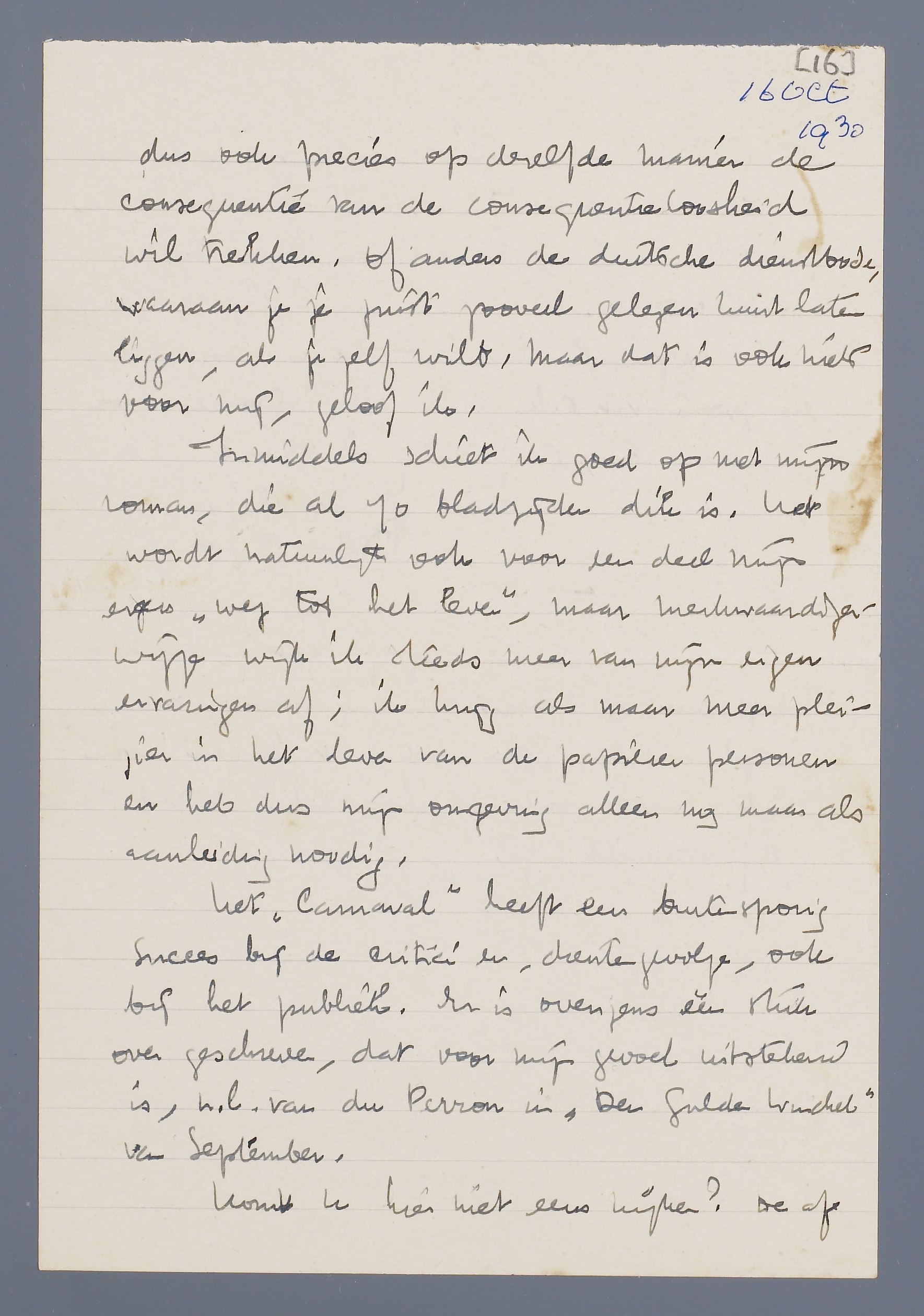 Het ‘Carnaval’ heeft een buitensporig succes bij de critici en, dientengevolge, ook bij het publiek. Er is overigens een stuk over geschreven, dat voor mijn gevoel uitstekend is, nl. van du Perron in ‘Den Gulden Winckel’ van September.