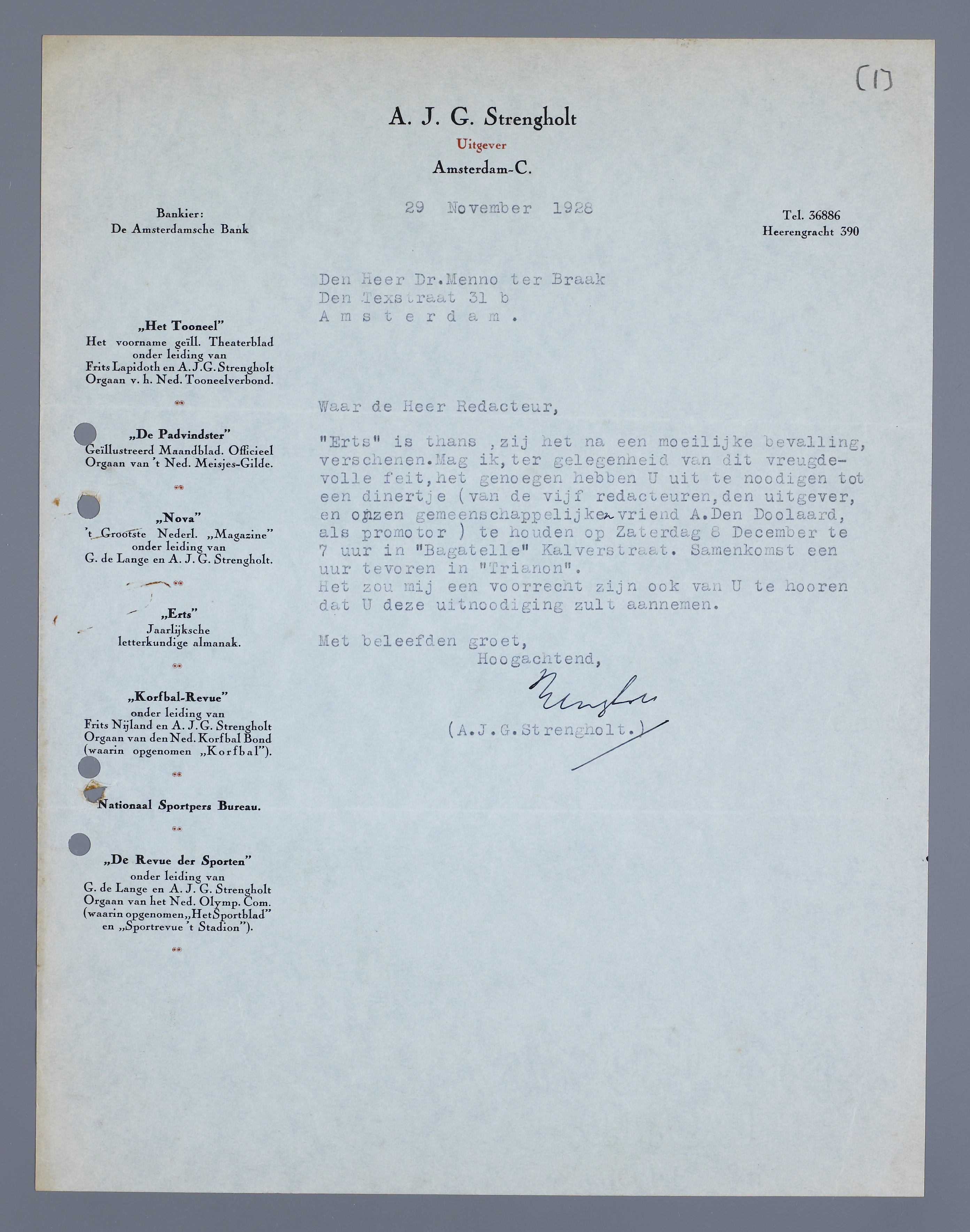 ‘Erts’ is thans, zij het na een moeilijke bevalling, verschenen. Mag ik, ter gelegenheid van dit vreugdevolle feit, het genoegen hebben U uit te nodigen tot een dinertje (van de vijf redacteuren, den uitgever, en onzen gemeenschappelijken vriend A. Den Doolaard, als promotor) te houden op Zaterdag 8 December te 7 uur in ‘Bagatelle’ Kalverstraat. Samenkomst een uur tevoren in ‘Trianon’.