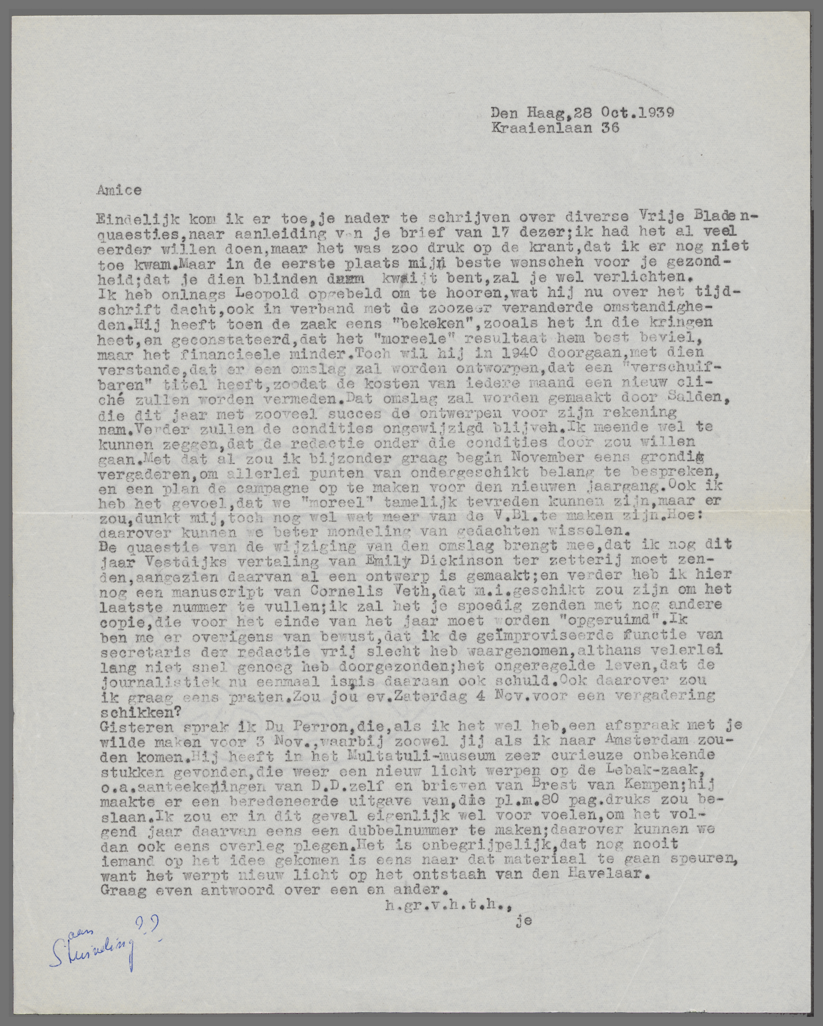 Eindelijk kom ik er toe, je nader te schrijven over diverse Vrije Bladen-quaesties, naar aanleiding van je brief van 17 dezer; ik had het al veel eerder willen doen, maar het was zoo druk op de krant, dat ik er nog niet toe kwam. Maar in de eerste plaats mijn beste wenschen voor je gezondheid; dat je dien blinden darm kwijt bent, zal je wel verlichten. Ik heb onlangs Leopold opgebeld om te hooren, wat hij nu over het tijdschrift dacht, ook in verband met de zoozeer veranderde omstandigheden. Hij heeft toen de zaak eens ‘bekeken’, zooals het in die kringen heet, en geconstateerd, dat het ‘moreele’ resultaat hem best beviel, maar het financieele minder. Toch wil hij in 1940 doorgaan, met dien verstande, dat er een omslag zal worden ontworpen, dat een ‘verschuifbaren’ titel heeft, zoodat de kosten van iedere maand een nieuw cliché zullen worden vermeden. Dat omslag zal worden gemaakt door Salden, die dit jaar met zooveel succes de ontwerpen voor zijn rekening nam. Verder zullen de condities ongewijzegd blijven. Ik meende wel te kunnen zeggen, dat de redactie onder die condities door zou willen gaan. Met dat al zou ik bijzonder graag begin November eens grondig vergaderen, om allerlei punten van ondergeschikt belang te bespreken, en een plan de campagne op te maken voor den nieuwen jaargang. Ook ik heb het gevoel, dat we ‘moreel’ tamelijk tevreden kunnen zijn, maar er zou, dunkt mij, toch nog wel wat meer van de V.Bl. te maken zijn. Hoe: daarover kunnen we beter mondeling van gedachten wisselen.