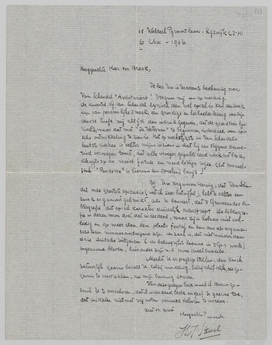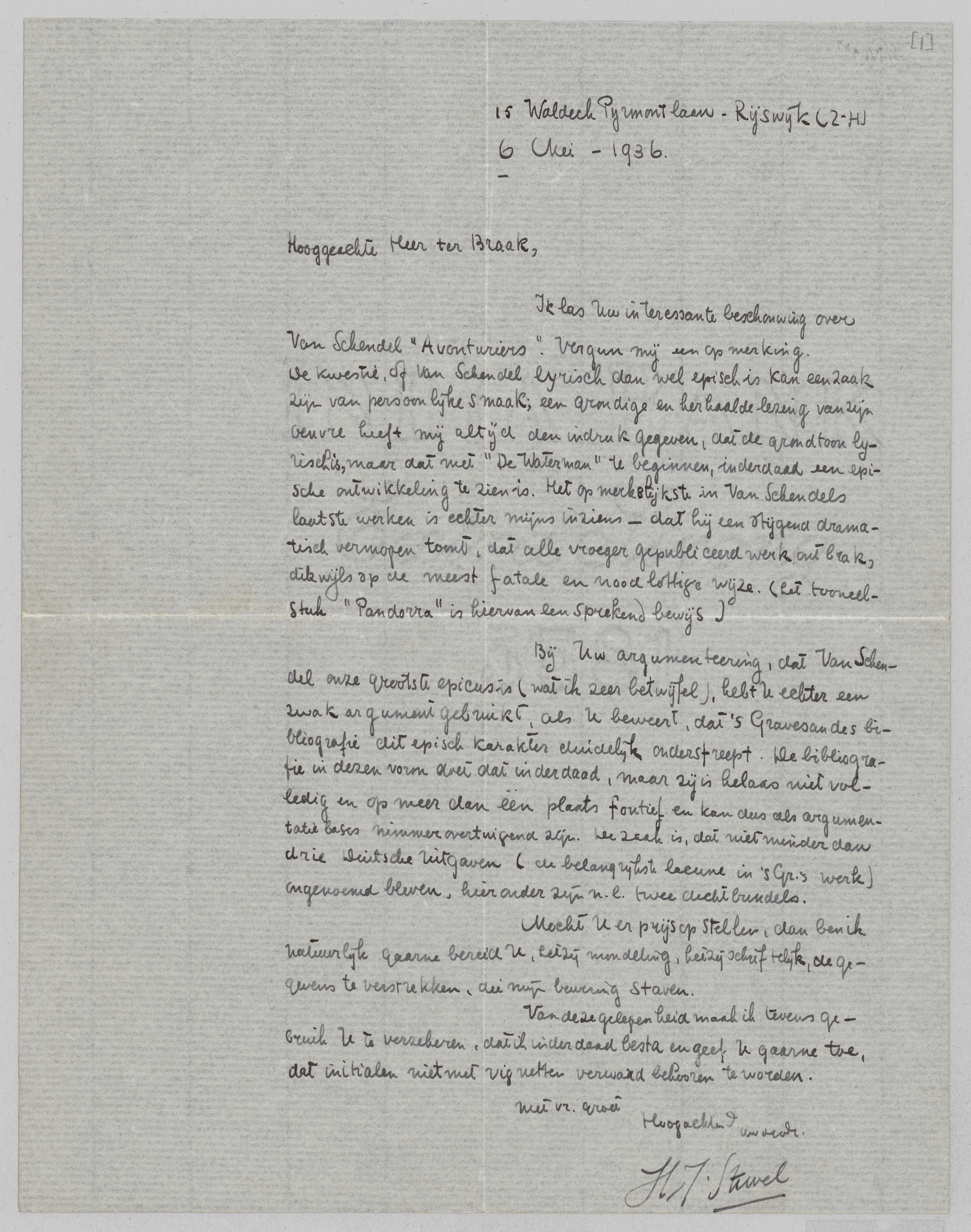 Ik las Uw interessante beschouwing over Van Schendel ‘Avonturiers’. Vergun mij een opmerking. De kwestie, of Van Schendel lyrisch dan wel episch is kan een zaak zijn van persoonlijke smaak; een grondige een herhaalde lezing van zijn oeuvre heeft mij altijd den indruk gegeven, dat de grondtoon lyrisch is, maar dat met ‘De Waterman’ te beginnen, inderdaad een epische ontwikkeling te zien is. Het opmerkelijkste in Van Schendels laatste werken is echter mijns inziens - dat hij een stijgend dramatisch vermogen toont, dat alle vroeger gepubliceerd werk ontbrak, dikwijls op de meest fatale en noodlottige wijze. (het tooneelstuk ‘Pandorra’ is hiervan een sprekend bewijs).