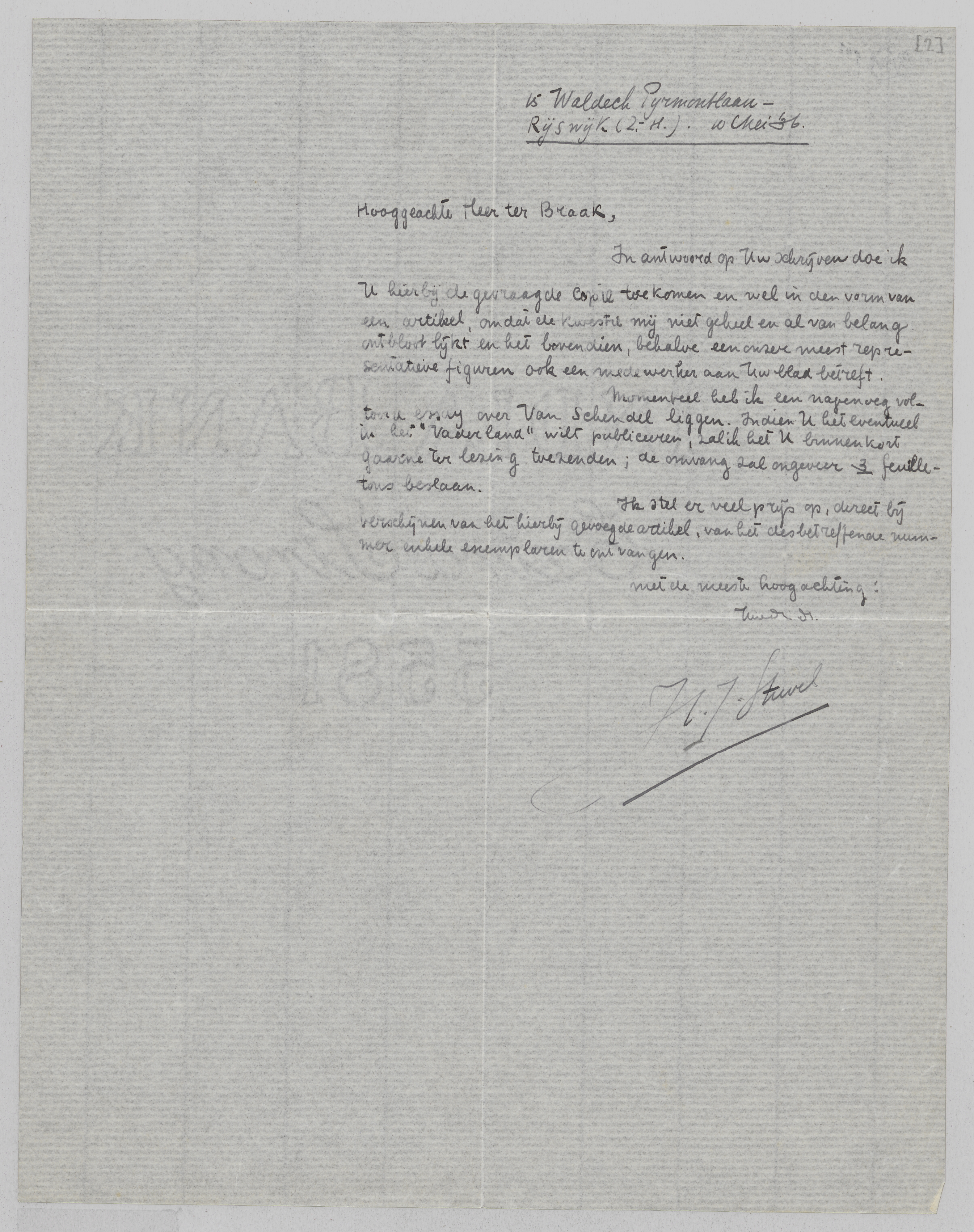 Momenteel heb ik een nagenoeg voltooid essay over Van Schendel liggen. Indien U het eventueel in het ‘Vaderland’ wilt publiceeren, zal ik het U binnenkort gaarne ter lezing toezenden; de omvang zal ongeveer 3 feuilletons beslaan.