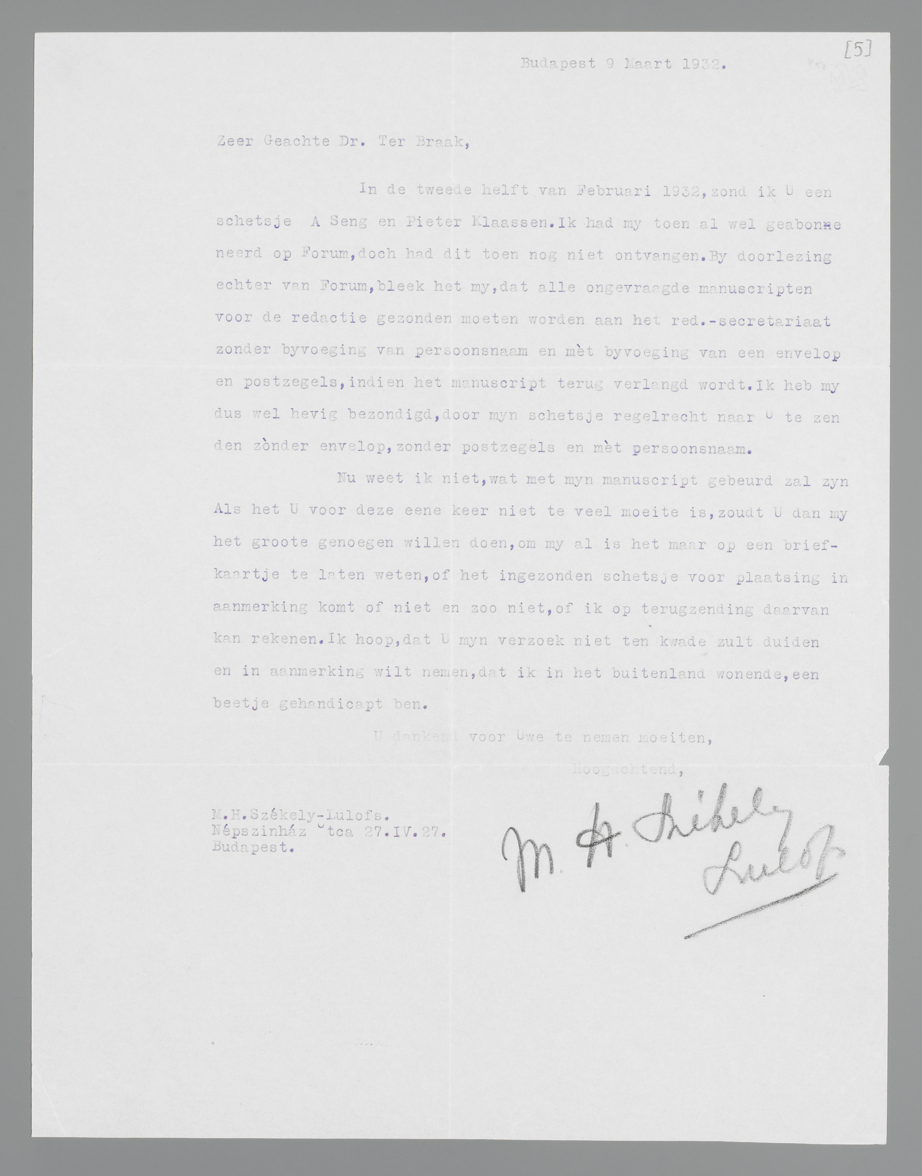 In de tweede helft van Februari 1932, zond ik U een schetsje A Seng en Pieter Klaassen. Ik had my toen al wel geabonneerd op Forum, doch had dit toen nog niet ontvangen. By doorlezing echter van Forum, bleek het my, dat alle ongevraagde manuscripten voor de redactie gezonden moeten worden aan het red.-secretariaat zonder byvoeging van persoonsnaam en mèt byvoeging van een envelop en postzegels, indien het manuscript terugverlangd wordt. Ik heb my dus wel hevig bezondigd, door myn schetsje regelrecht naar U te zenden zònder envelop, zonder postzegels en mèt persoonsnaam.