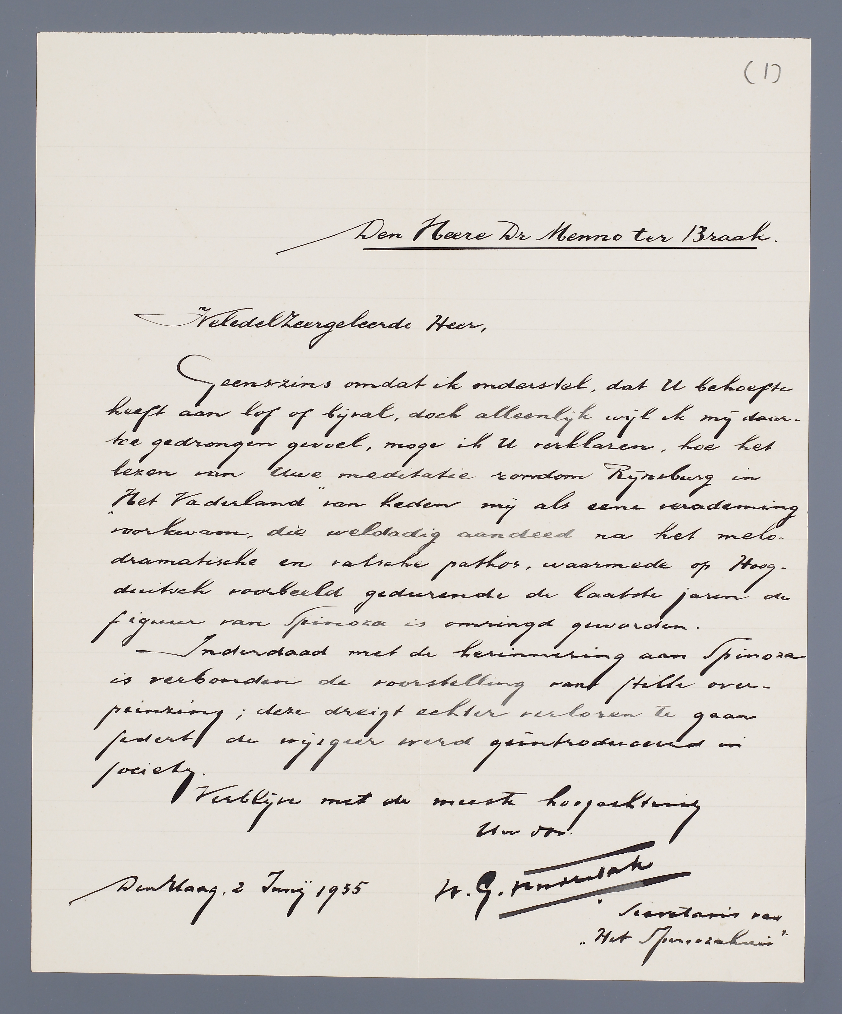 Geenszins omdat ik onderstel, dat U behoefte heeft aan lof of bijval, doch alleenlijk wijl ik mij daartoe gedrongen gevoel, moge ik U verklaren, hoe het lezen van Uwe meditatie rondom Rijnsburg in ‘Het Vaderland’ van heden mij als een verademing voorkwam, die weldadig aandeed na het melodramatische en valsche pathos, waarmede op Hoogduitsch voorbeeld gedurende de laatste jaren de figuur van Spinoza is omringd geworden.