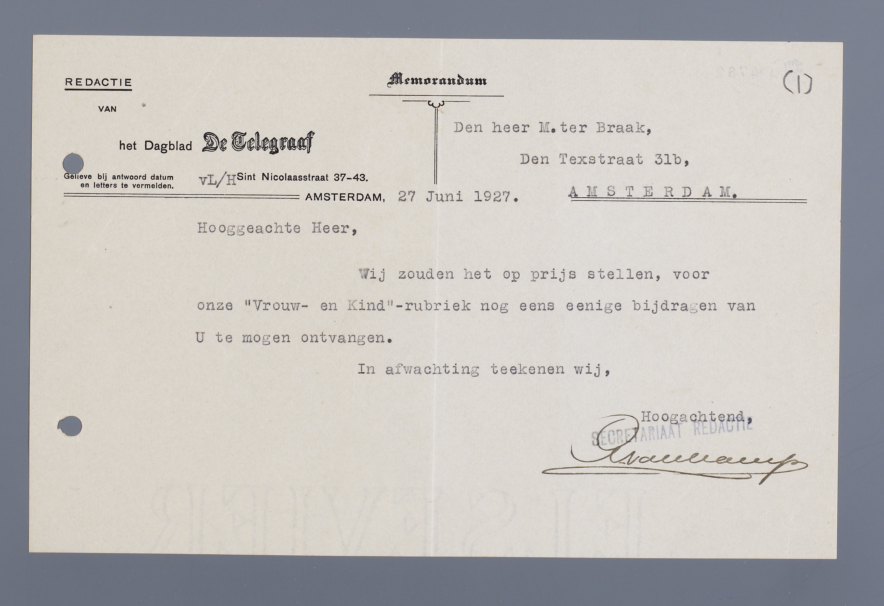 Wij zouden het op prijs stellen, voor onze ‘Vrouw- en Kind’-rubriek nog eens eenige bijdragen van U te mogen ontvangen.