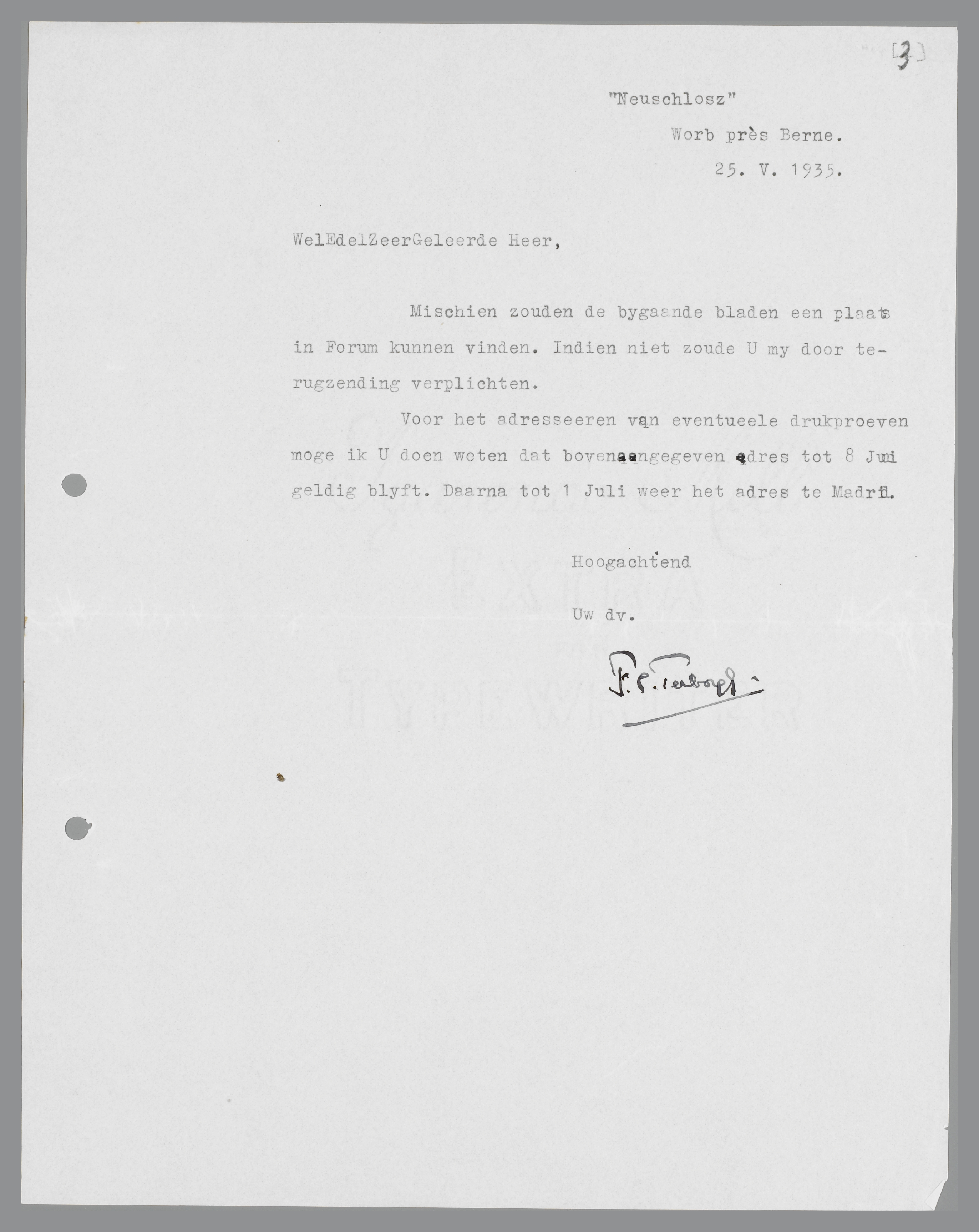 Voor het adresseeren van eventueele drukproeven moge ik U doen weten dat bovenaangegeven adres tot 8 Juni geldig blyft. Daarna tot 1 Juli weer het adres te Madrid.