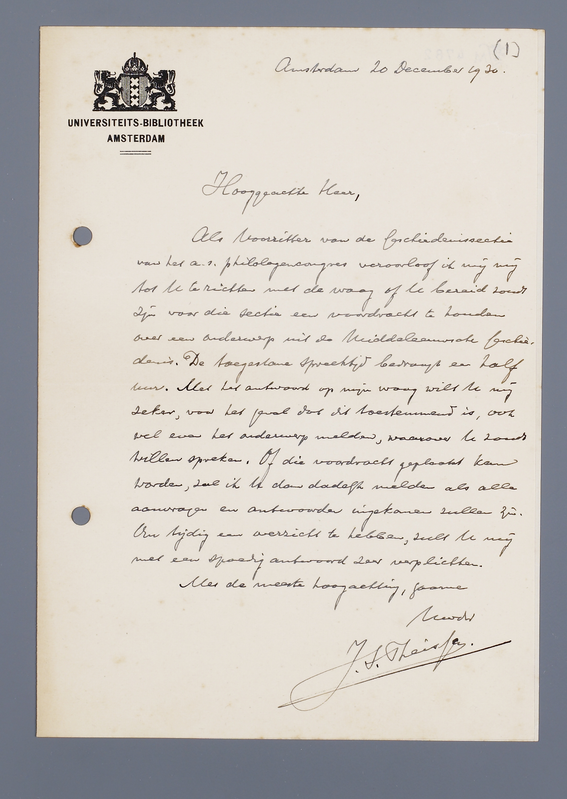 Als voorzitter van de geschiedenissectie van het a.s. philologencongres veroorloof ik mij mij tot U te richten met de vraag of U bereid zoudt zijn voor die sectie een voordracht te houden over een onderwerp uit de Middeleeuwse geschiedenis. De toegestane spreektijd bedraagt een half uur. Met het antwoord op mijn vraag wilt U mij zeker, voor het geval dat dit toestemmend is, ook wel even het onderwerp melden, waarover U zoudt willen spreken. Of die voordracht geplaatst kan worden, doe ik U dan dadelijk melden als alle aanvragen en antwoorden ingekomen zullen zijn.