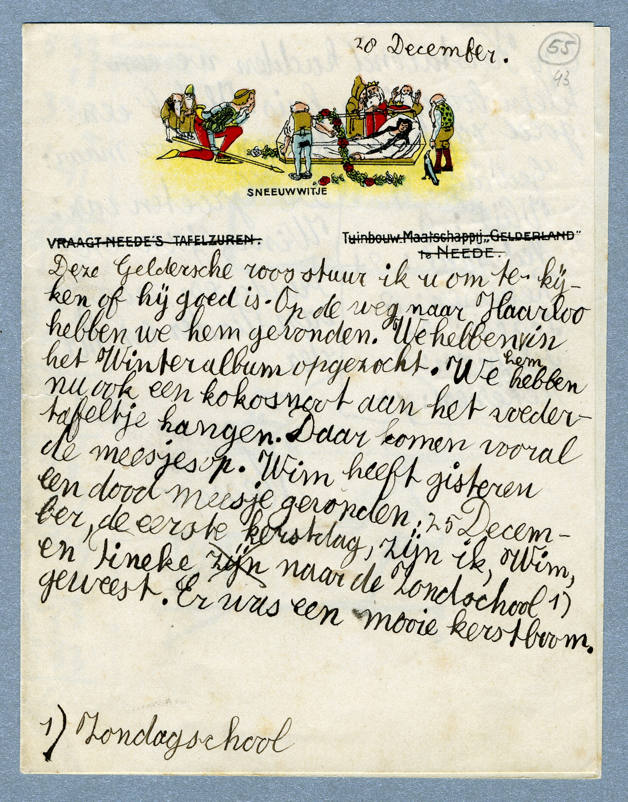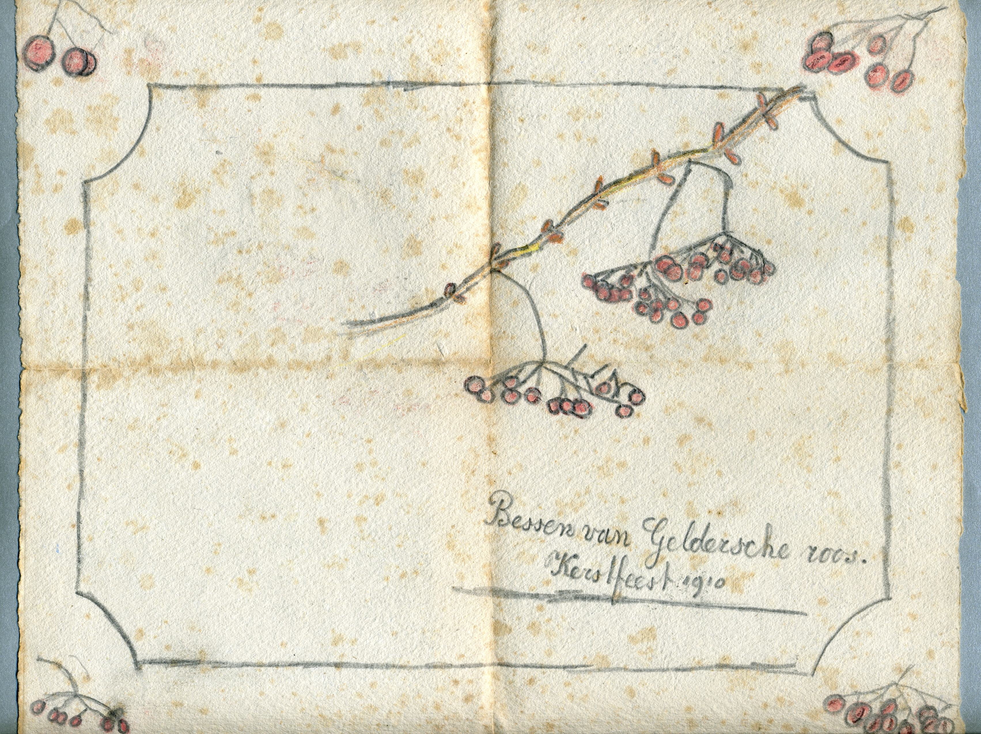 Deze Geldersche roos stuur ik u om te kijken of hij goed is. Op de weg naar Haarloo hebben we hem gevonden. We hebben hem in het Winteralbum opgezocht. We hebben nu ook een kokosnoot aan het voedertafeltje hangen. Daar komen vooral de meesjes op. Wim heeft gisteren een dood meesje gevonden. 25 December, de eerste kerstdag, zijn ik, Wim, en Tineke naar de Zondschool 1) geweest. Er was een mooie kerstboom.