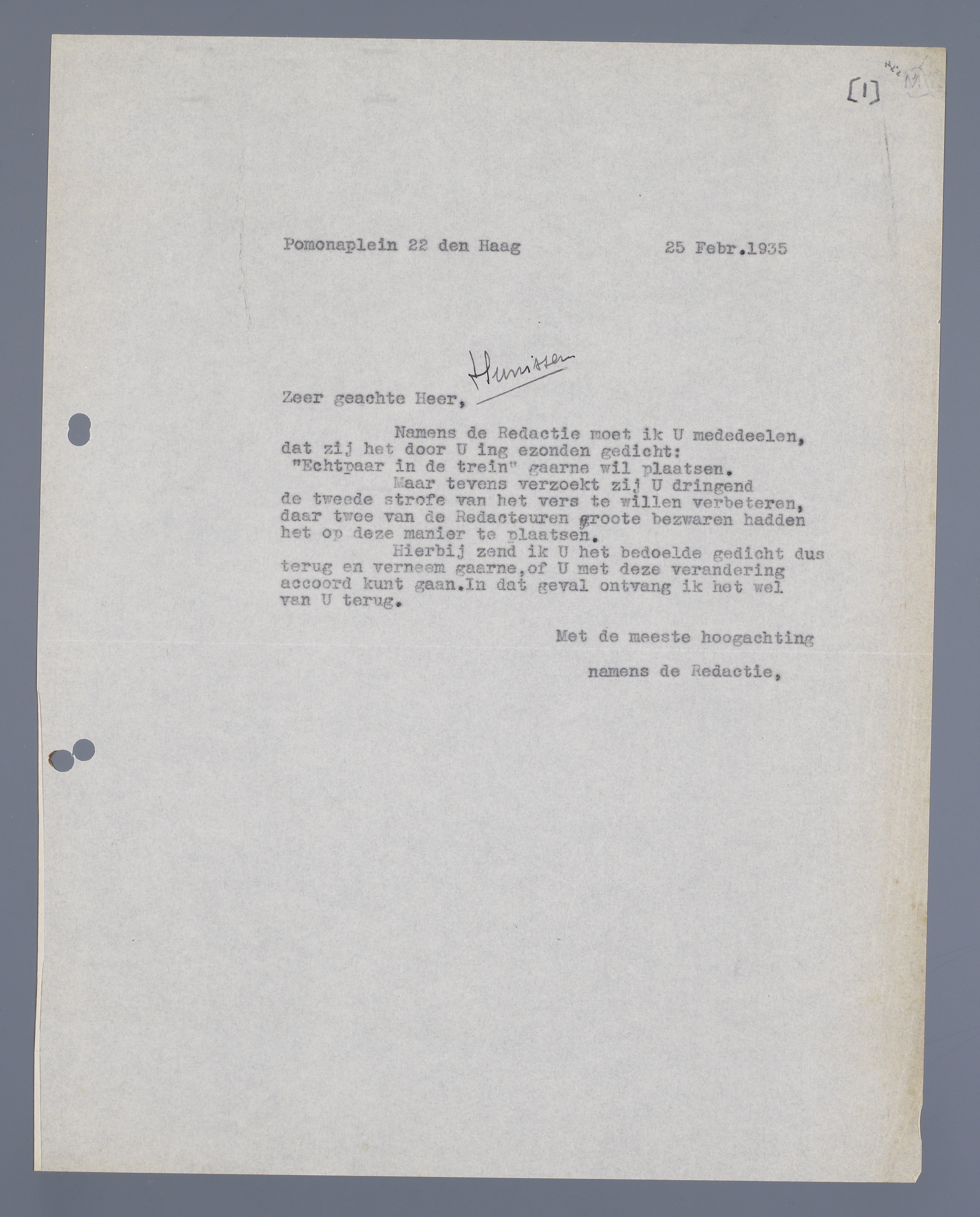 Hierbij zend ik U het bedoelde gedicht dus terug en verneem gaarne, of U met deze verandering accoord kunt gaan. In dat geval ontvang ik het wel van U terug.