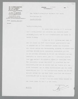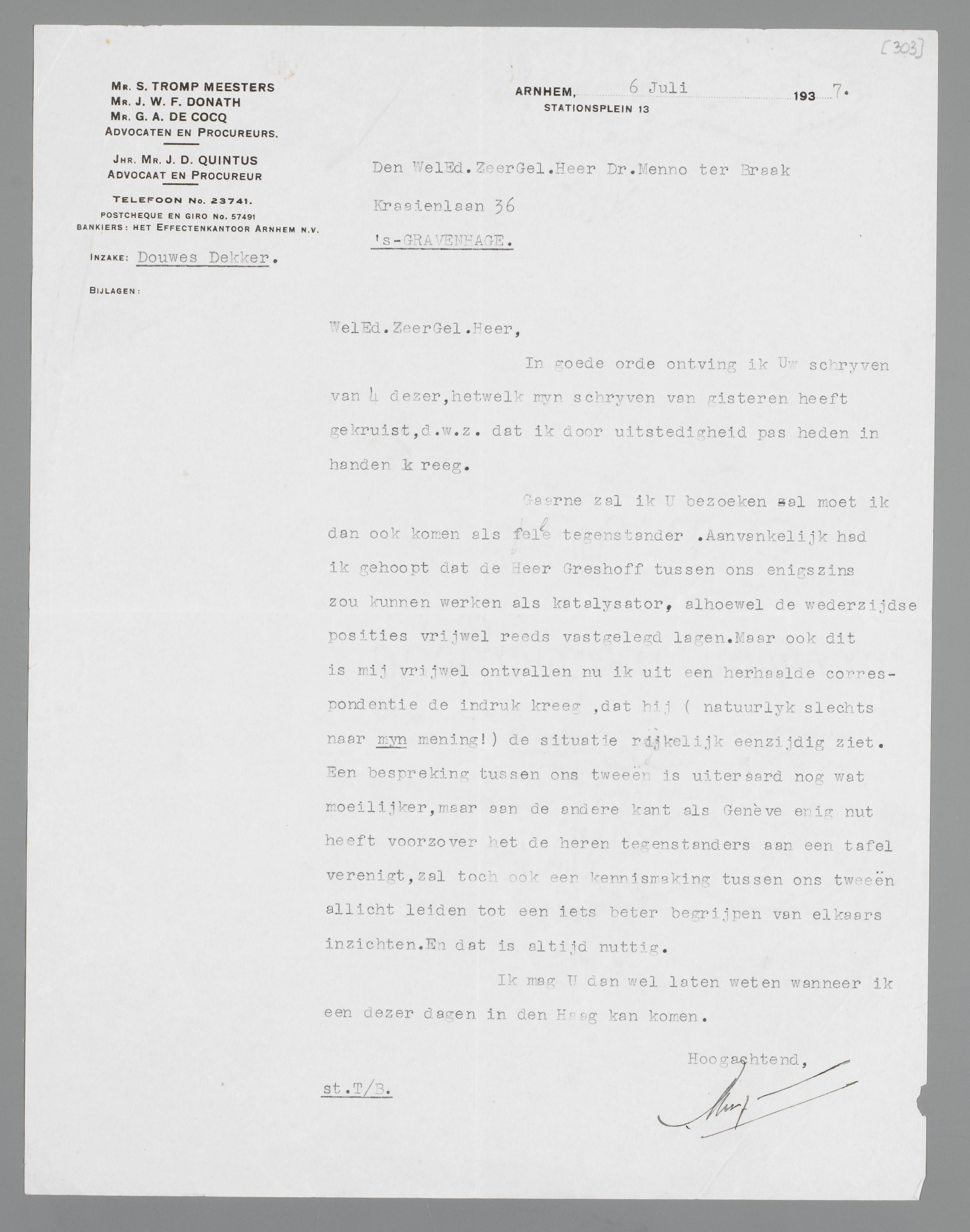 Gaarne zal ik U bezoeken al moet ik dan ook komen als felle tegenstander. Aanvankelijk had ik gehoopt dat de Heer Greshoff tussen ons enigszins zou kunnen werken als katalysator, alhoewel de wederzijdse posities vrijwel reeds vastgelegd lagen. Maar ook dit is mij vrijwel ontvallen nu ik uit een herhaalde correspondentie de indruk kreeg, dat hij (natuurlyk slechts naar myn mening!) de situatie rijkelijk eenzijdig ziet. Een bespreking tussen ons tweeën is uiteraard nog wat moeilijker, maar aan de andere kant als Genève enig nut heeft voorzover het de heren tegenstanders aan een tafel verenigt, zal toch ook een kennismaking tussen ons tweeën allicht leiden tot een iets beter begrijpen van elkaars inzichten. En dat is altijd nuttig.