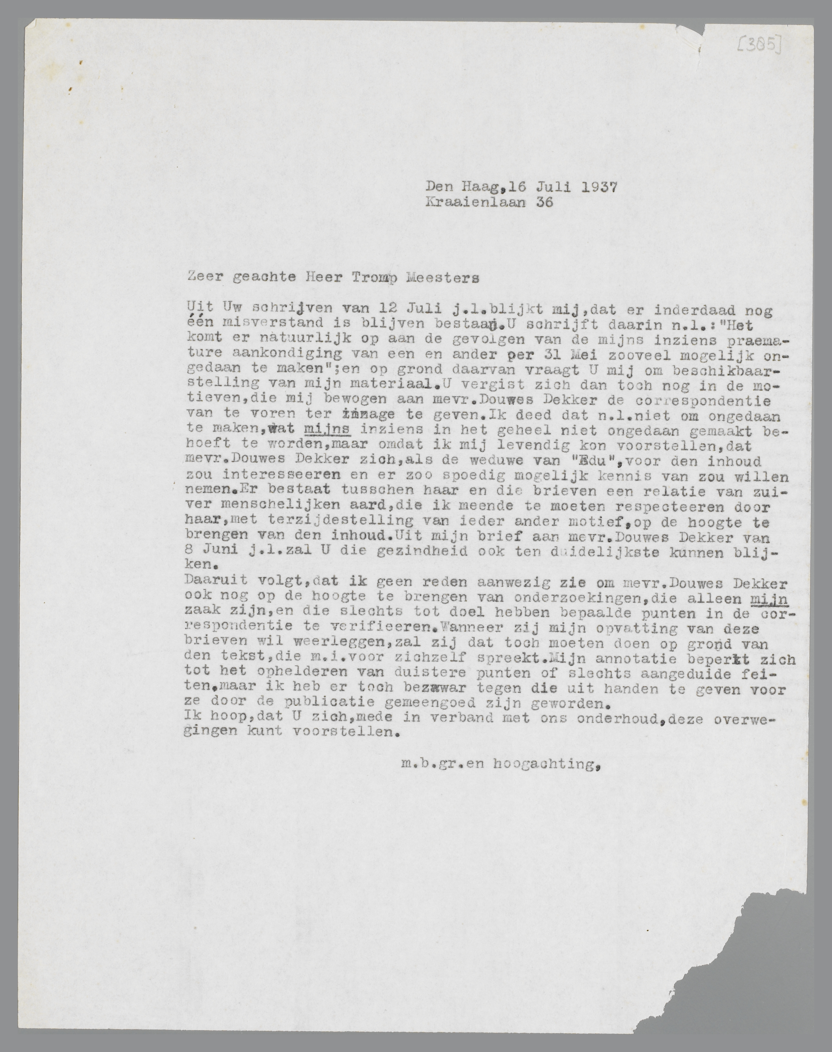 Uit Uw schrijven van 12 Juli j.l. blijkt mij, dat er inderdaad nog één misverstand is blijven bestaan. U schrijft daarin n.l.: ‘Het komt er natuurlijk op aan de gevolgen van de mijns inziens praemature aankondiging van een en ander per 31 Mei zooveel mogelijk ongedaan te maken’; en op grond daarvan vraagt U mij om beschikbaarstelling van mijn materiaal. U vergist zich dan toch nog in de motieven, die mij bewogen aan mevr. Douwes Dekker de correspondentie van te voren ter inzage te geven. Ik deed dat n.l. niet om ongedaan te maken, wat mijns inziens helemaal niet ongedaan gemaakt behoeft te worden, maar omdat ik mij levendig kon voorstellen, dat mevr. Douwes Dekker zich, als de weduwe van ‘Edu’, voor den inhoud zou interesseeren en er zoo spoedig mogelijk kennis van zou willen nemen. Er bestaat tusschen haar en die brieven een relatie van zuiver menschelijken aard, die ik meende te moeten respecteeren door haar, met terzijdestelling van ieder ander motief, op de hoogte te brengen van den inhoud. Uit mijn brief aan mevr. Douwes Dekker van 8 Juni j.l. zal U die gezindheid ook ten duidelijkste kunnen blijken.