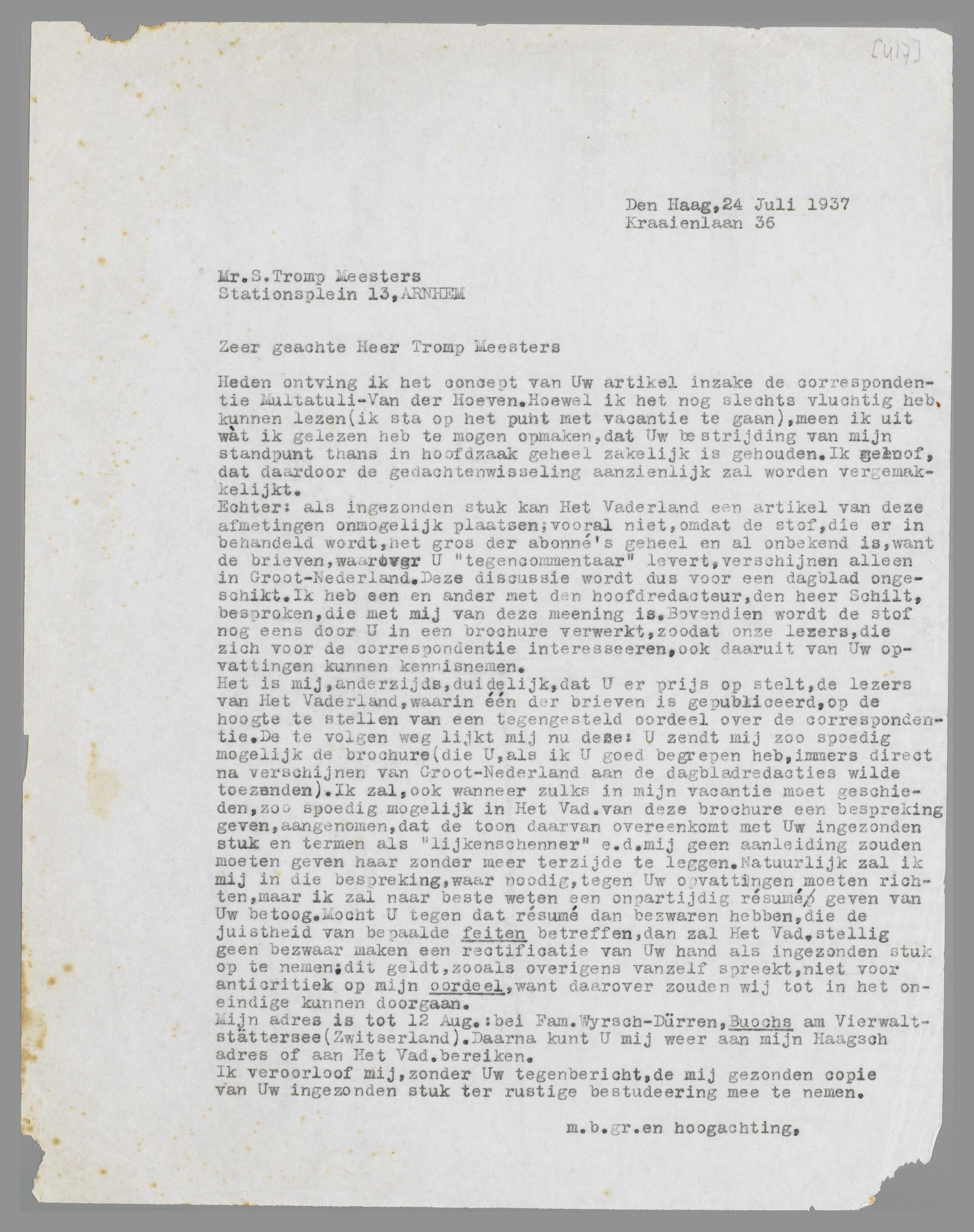 Heden ontving ik het concept van Uw artikel inzake de correspondentie Multatuli-Van der Hoeven. Hoewel ik het nog slechts vluchtig heb kunnen lezen (ik sta op het punt met vacantie te gaan), meen ik uit wàt ik gelezen heb te mogen opmaken, dat uw bestrijding van mijn standpunt thans in hoofdzaak geheel zakelijk is gehouden. Ik geloof, dat daardoor de gedachtenwisseling aanzienlijk zal worden vergemakkelijkt.