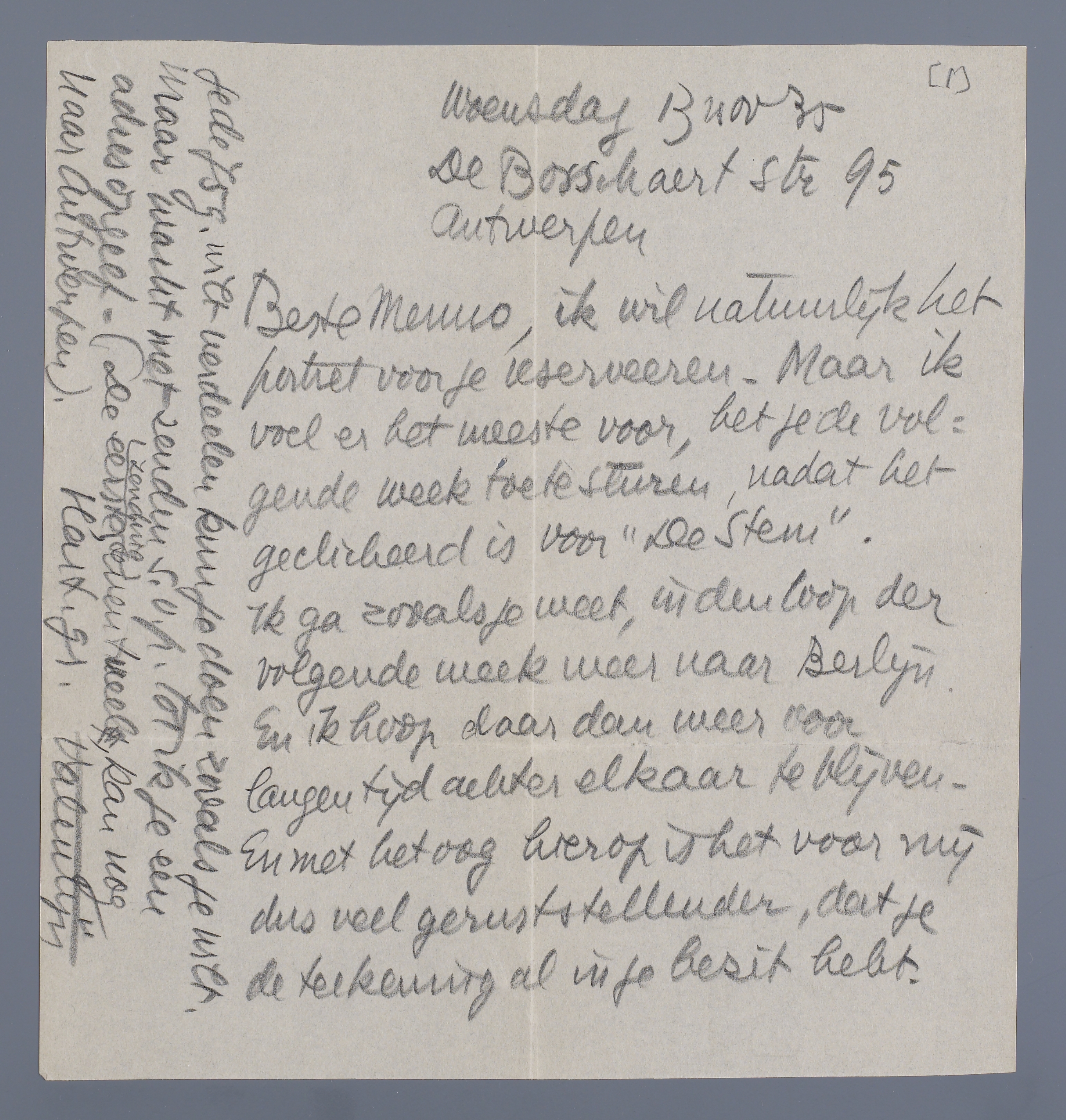 Ik ga zooals je weet, in den loop der volgende week weer naar Berlijn. En ik hoop daar dan weer voor langen tijd achter elkaar te blijven. En met het oog hierop is het voor mij dus veel geruststellender, dat je de teekening al in je bezit hebt.