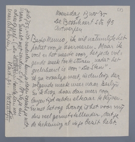 Dus, je zou me een groot genoegen doen met de zaak, als bovenstaand vermeld, als afgesproken te beschouwen. In hoeveel termijnen je de 75 g. wilt verdeelen kun je doen zooals je wilt. Maar wacht met zenden s.v.p. tot ik je een adres opgeef. (De eerste zending, eventueel, kan nog naar Antwerpen.)