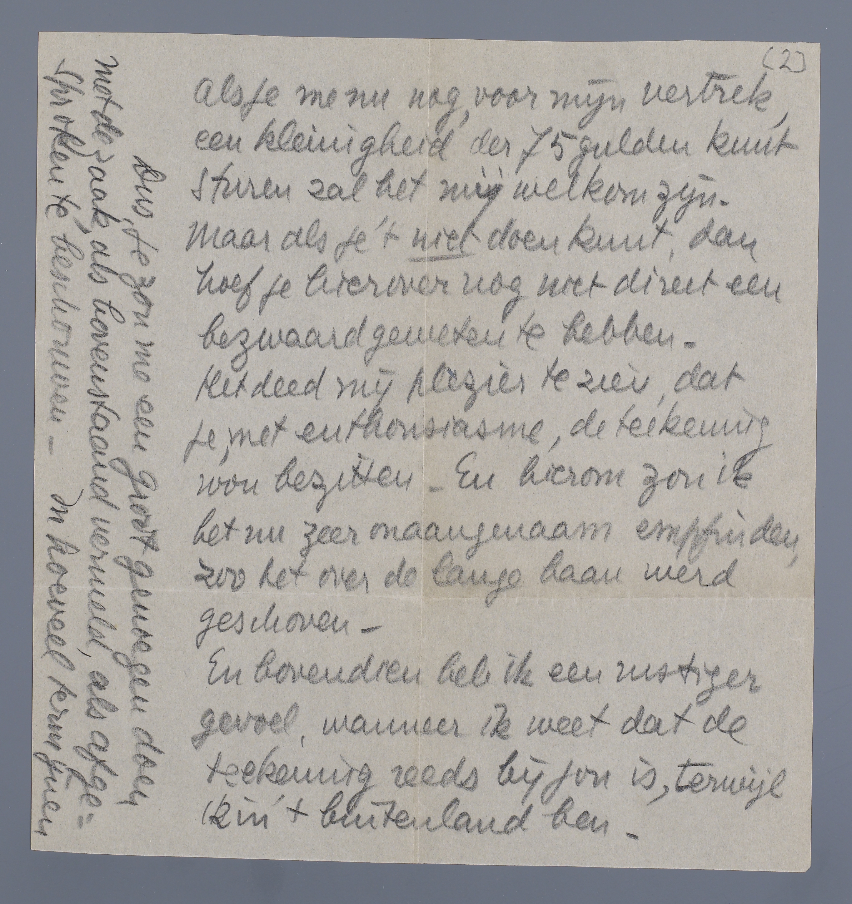 Als je me nu nog, voor mijn vertrek, een kleinigheid der 75 gulden kunt sturen zal het mij welkom zijn. Maar als je 't niet doen kunt, dan hoef je hierover nog niet direct een bezwaard geweten te hebben.