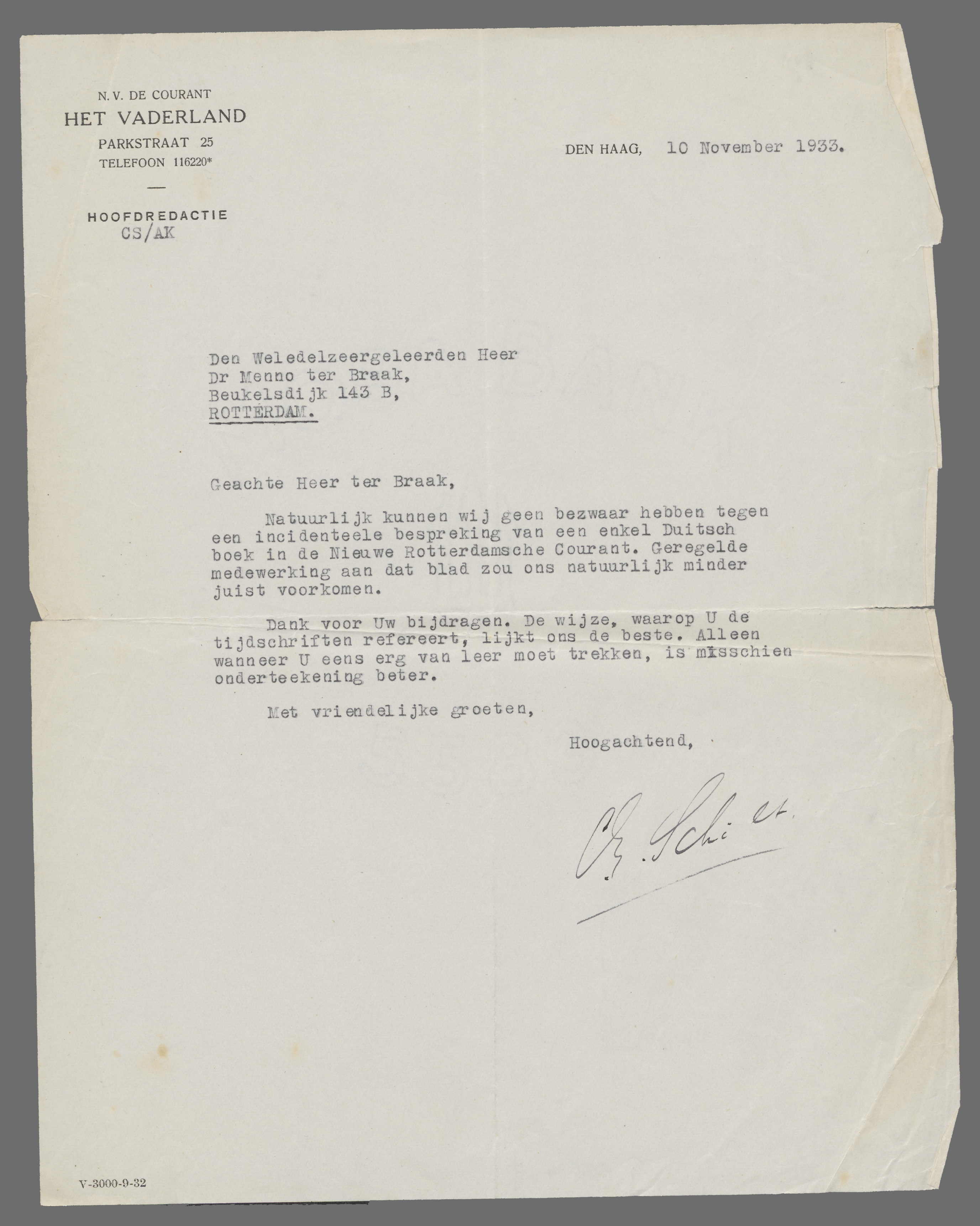 Natuurlijk kunnen wij geen bezwaar hebben tegen een incidenteele bespreking van een enkel Duitsch boek in de Nieuwe Rotterdamsche Courant. Geregelde medewerking aan dat blad zou ons natuurlijk minder juist voorkomen.