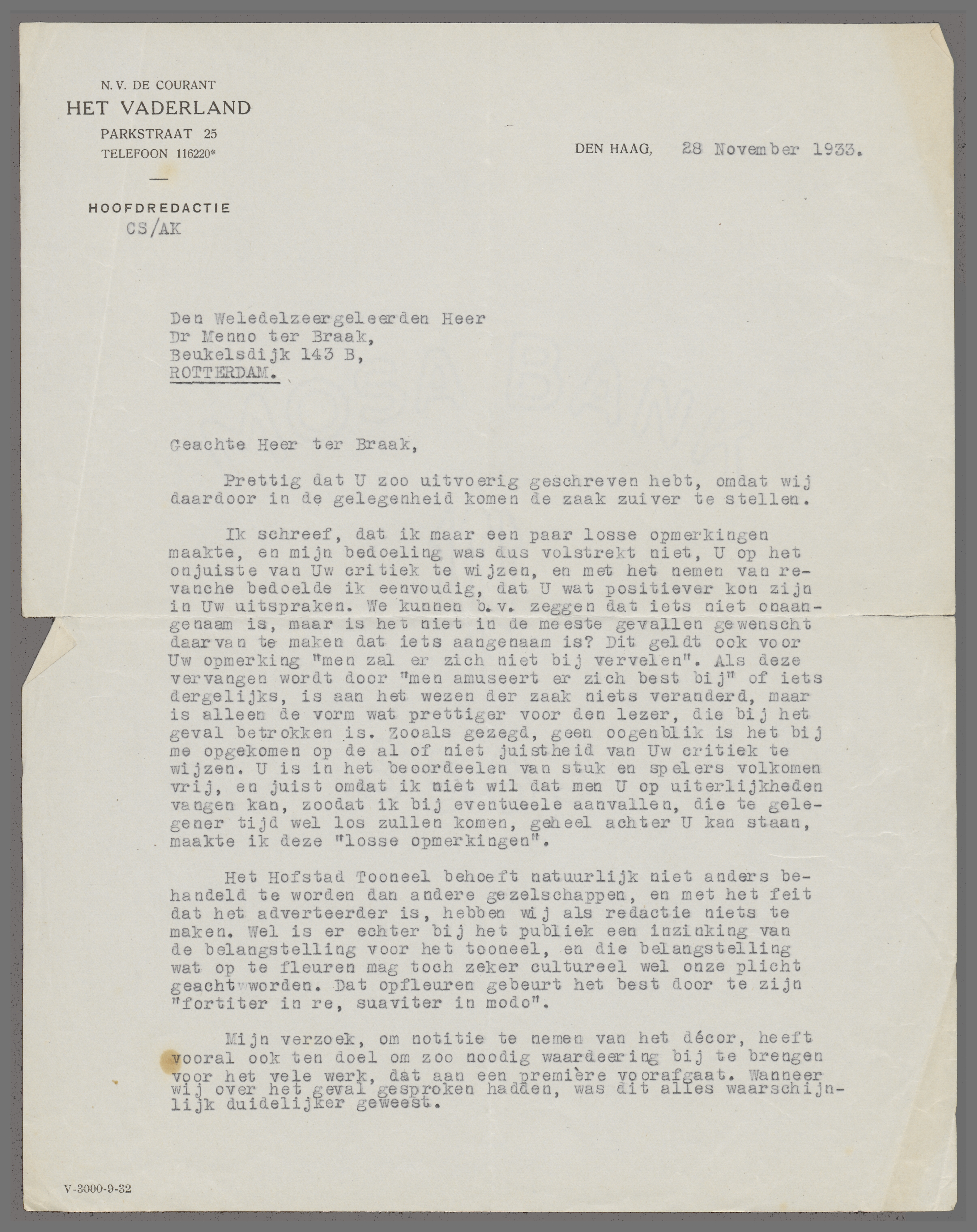 Ik schreef, dat ik maar een paar losse opmerkingen maakte, en mijn bedoeling was dus volstrekt niet, U op het onjuiste van Uw critiek te wijzen, en met het nemen van revanche bedoelde ik eenvoudig, dat U wat positiever kon zijn in Uw uitspraken. We kunnen b.v. zeggen dat iets niet onaangenaam is, maar is het niet in de meeste gevallen gewenscht daarvan te maken dat iets aangenaam is? Dit geldt ook voor Uw opmerking ‘men zal er zich niet bij vervelen’. Als deze vervangen wordt door ‘men amuseert er zich best bij’ of iets dergelijks, is aan het wezen der zaak niets veranderd, maar is alleen de vorm wat prettiger voor den lezer, die bij het geval betrokken is. Zooals gezegd, geen oogenblik is het bij me opgekomen op de al of niet juistheid van Uw critiek te wijzen. U is in het beoordeelen van stuk en spelers volkomen vrij, en juist omdat ik niet wil dat men U op uiterlijkheden vangen kan, zoodat ik bij eventueele aanvallen, die te gelegener tijd wel los zullen komen, geheel achter U kan staan, maakte ik deze “losse opmerkingen”.