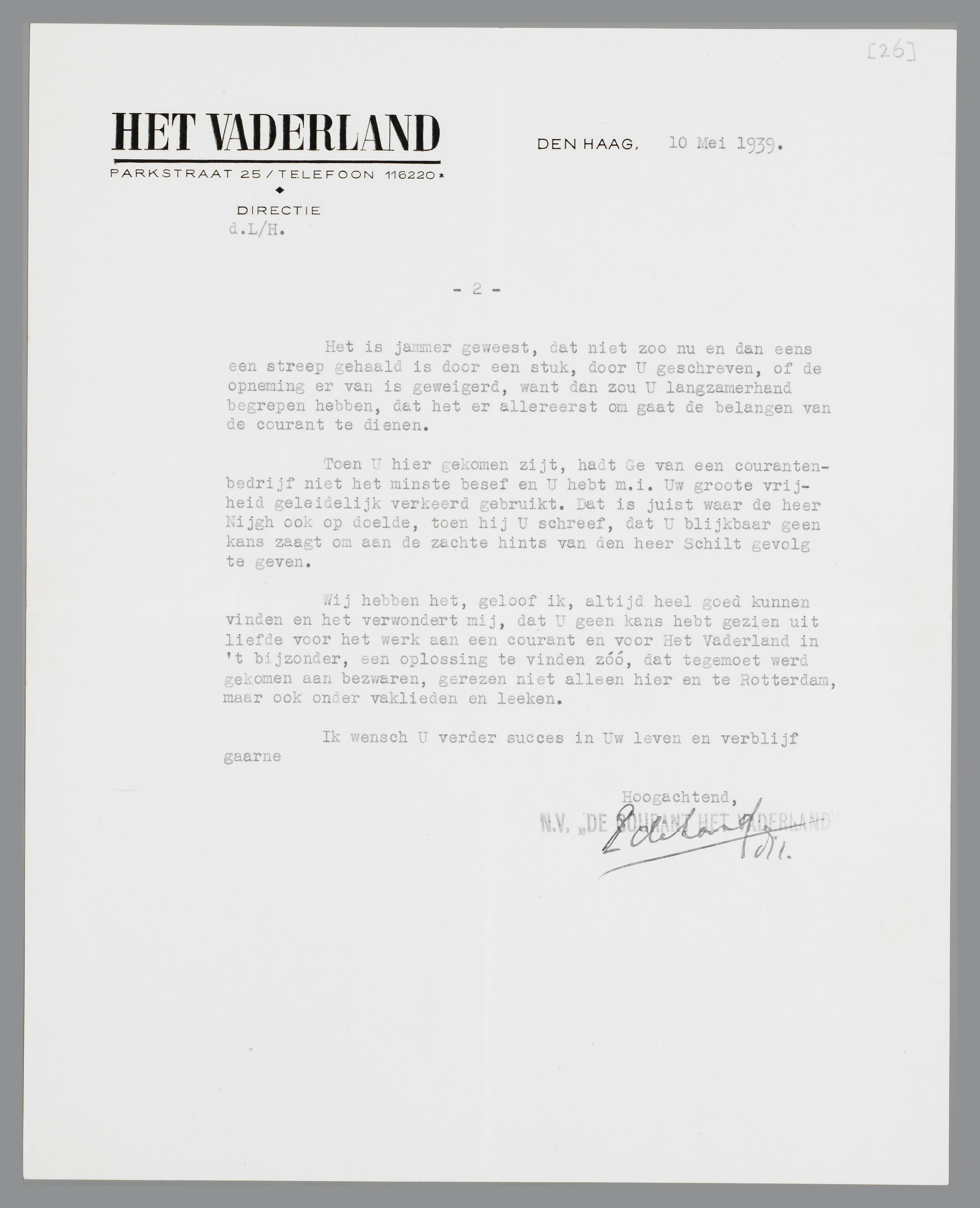 De heer Nijgh zond mij Uw brief tot hem gericht, waarmede U met ingang van 1 September 1939 ontslag verzoekt als redacteur van de rubriek Letteren en Kunst. U hebt mij trouwens van den inhoud van dezen brief in kennis gesteld, toen U mij zijt komen vertellen, dat het Uw plan was heen te gaan.