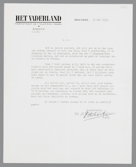Wij hebben het, geloof ik, altijd heel goed kunnen vinden en het verwondert mij, dat U geen kans hebt gezien uit liefde voor het werk aan een courant en voor Het Vaderland in 't bijzonder, een oplossing te vinden zóó, dat tegemoet werd gekomen aan de bezwaren, gerezen niet alleen hier en te Rotterdam, maar ook onder vaklieden en leeken.