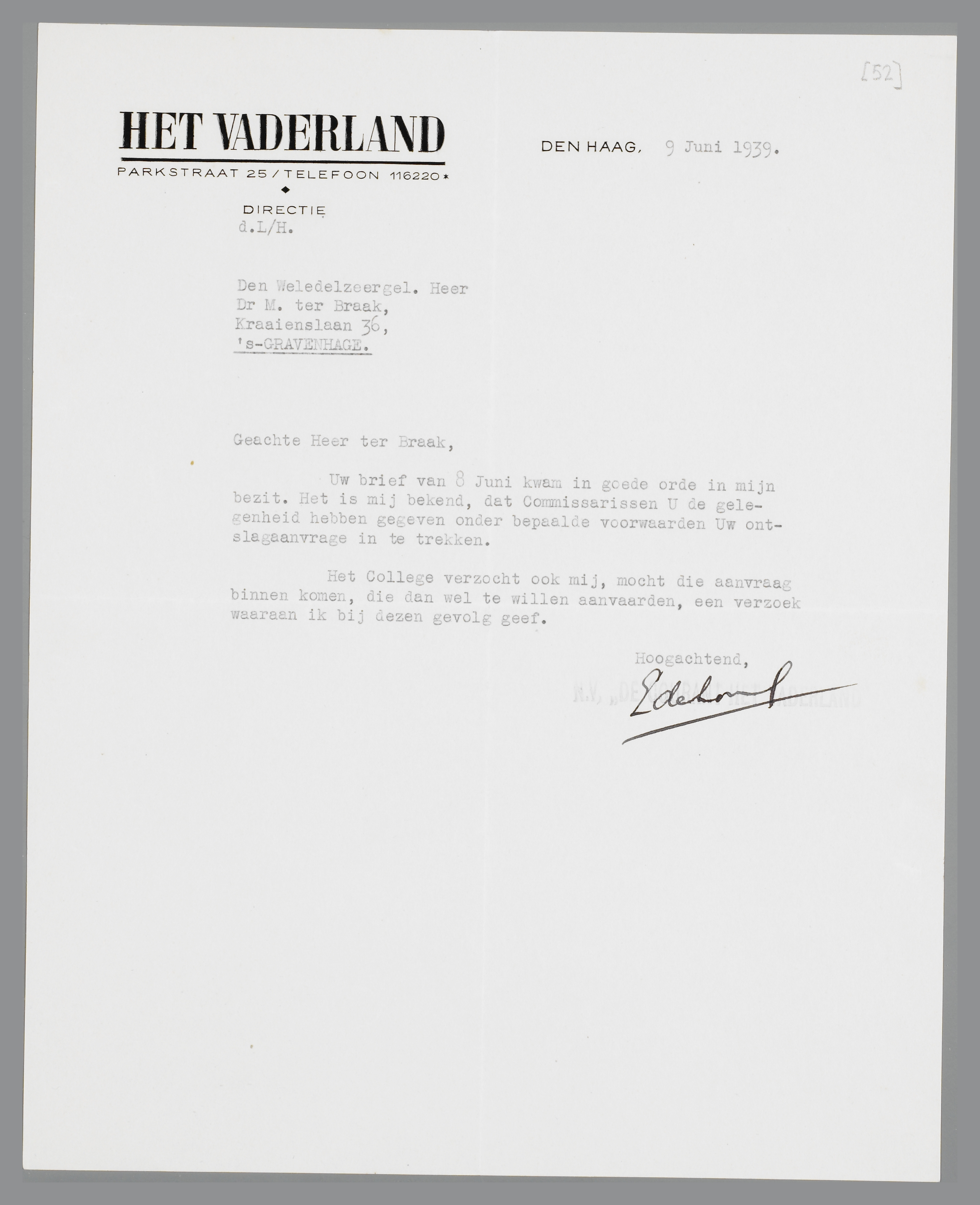 Uw brief van 8 Juni kwam in goede orde in mijn bezit. Het is mij bekend, dat Commissarissen U de gelegenheid hebben gegeven onder bepaalde voorwaarden Uw ontslagaanvrage in te trekken.