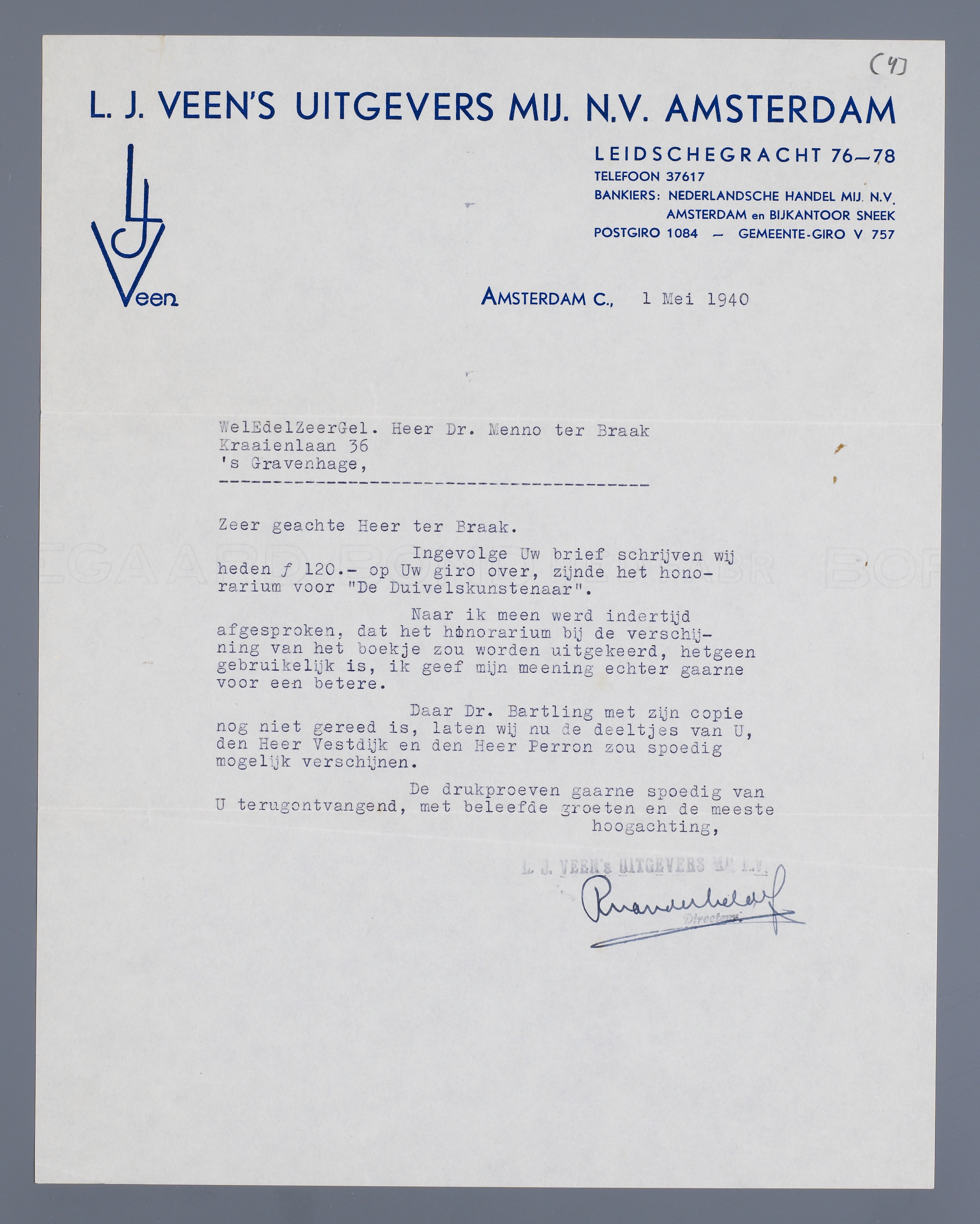 Ingevolge Uw brief schrijven wij heden f 120.- op Uw giro over, zijnde het honorarium voor ‘De Duivelskunstenaar’.