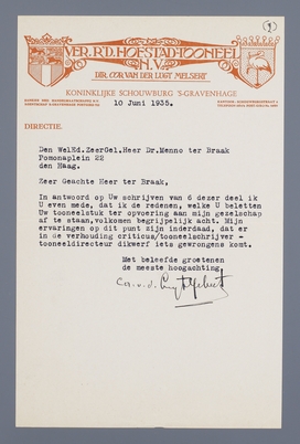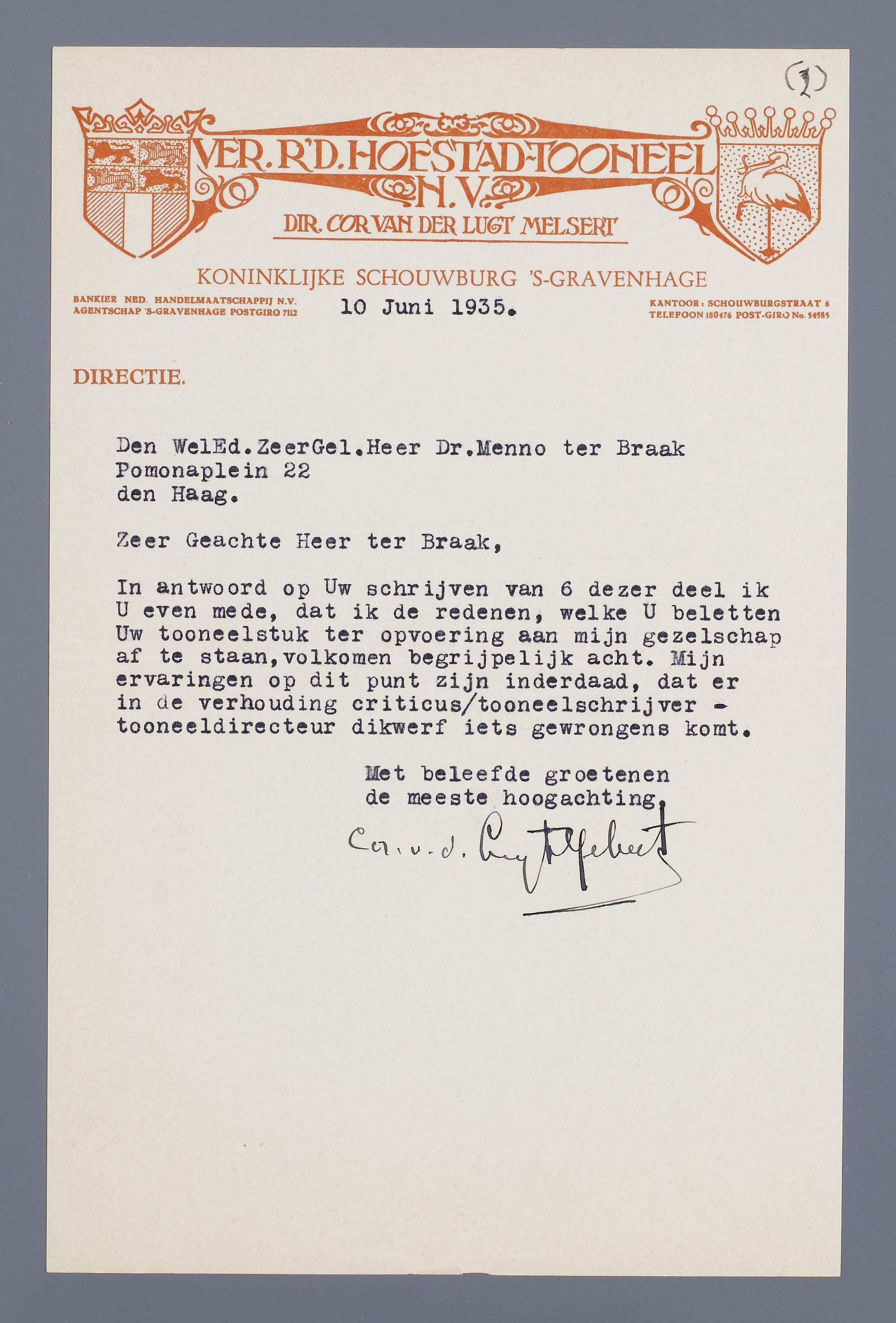 In antwoord op uw schrijven van 6 dezer deel ik u even mede, dat ik de redenen, welke U beletten Uw tooneelstuk ter opvoering aan mijn gezelschap af te staan, volkomen begrijpelijk acht. Mijn ervaringen op dit punt zijn inderdaad, dat er in de verhouding criticus/toneelschrijver - tooneeldirecteur dikwerf iets gewrongens komt.